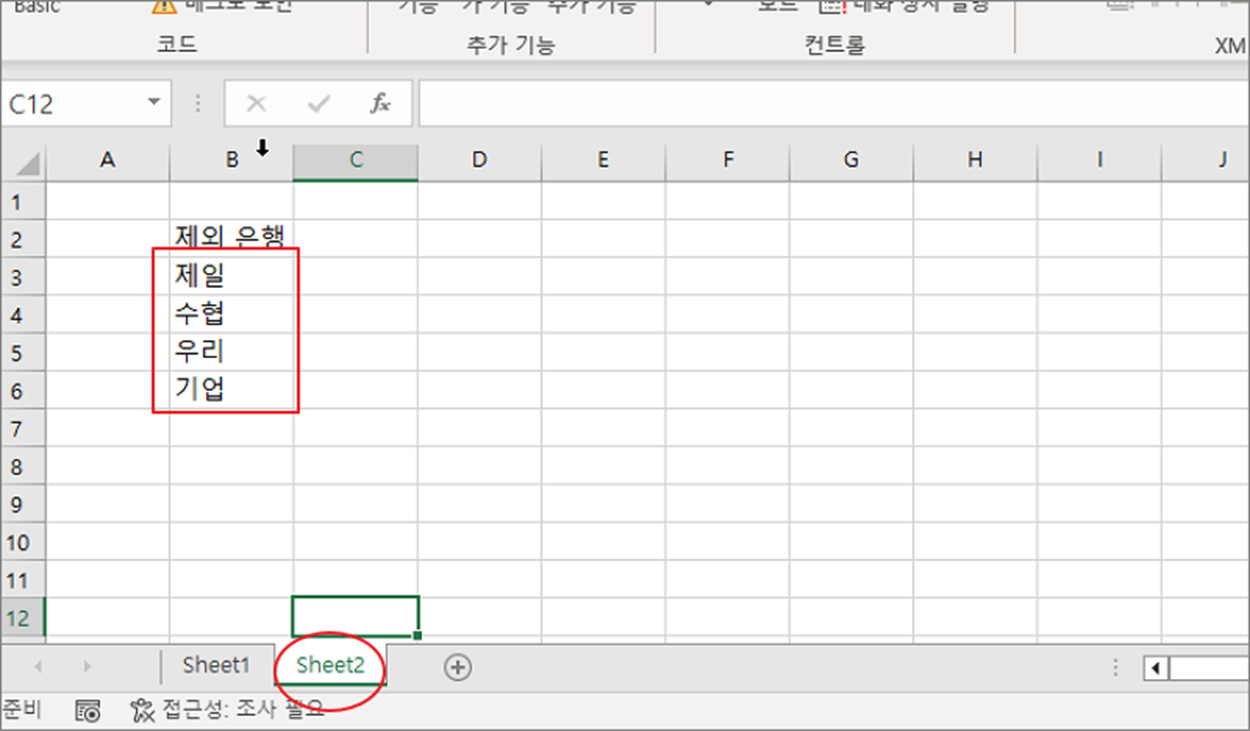▼ 소스를 설명하겠습니다. 핵심은 다른 시트에 입력한 제외 목록 영역을 읽어와서 For 문으로 반복하면서 비교하는 것입니다. Sheet2 에 제외할 은행 목록을 입력하고 영역에 데이터를 가져옵니다.