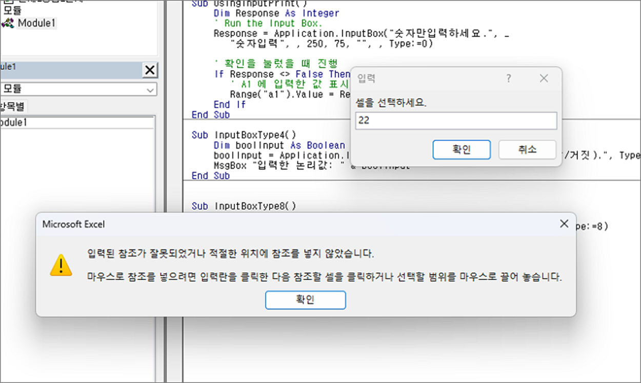 셀 주소가 아닌 다른 값이라도 판단되면 아래 그림과 같이 잘못된 값이라고 에러를 팝업창으로 출력합니다.