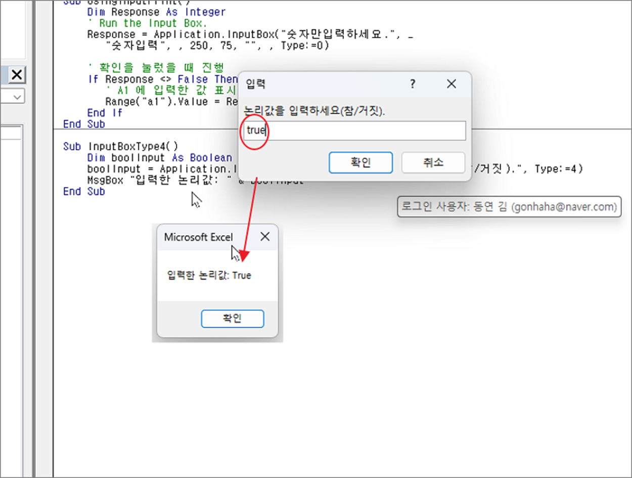 boolInput = Application.InputBox(Prompt:="논리값을 입력하세요(참/거짓).", Type:=4)