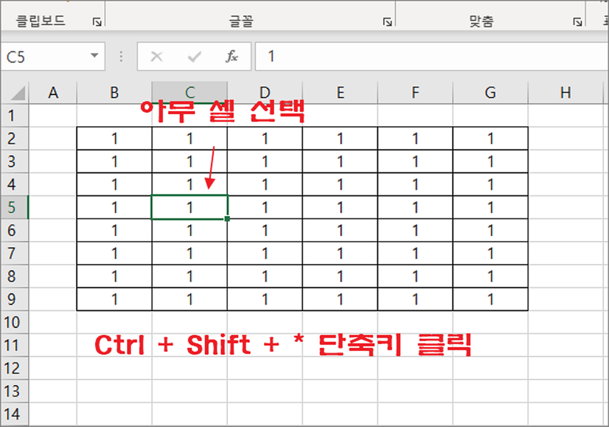 ▼ 엑셀 시트에서 연속된 데이터 영역 전체를 한 번에 선택하고 싶을 때 사용하는 단축키가 Ctrl + Shift + * 입니다. 영역에서 아무 셀이나 선택하고 단축키를 클릭해 보세요.