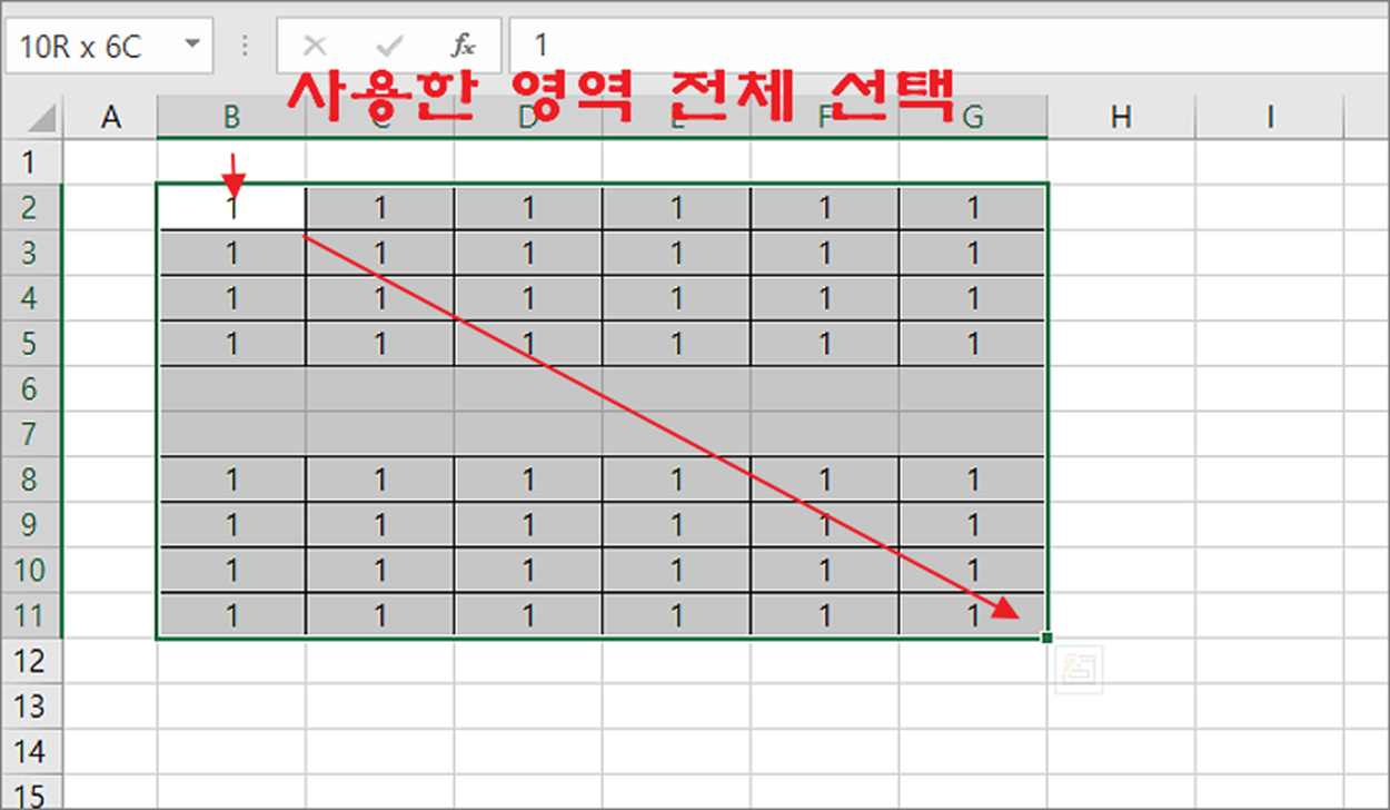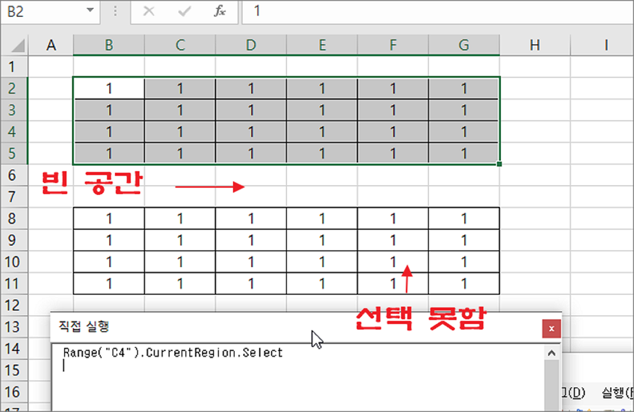 ▼ 그럼 그림처럼 빈공간이 생겼을 때 CurrentRegion 은 어떻게 동작할까요? 연결되지 않은 영역은 선택하지 못합니다. 이런 경우에는 UsedRange 속성을 사용합니다.