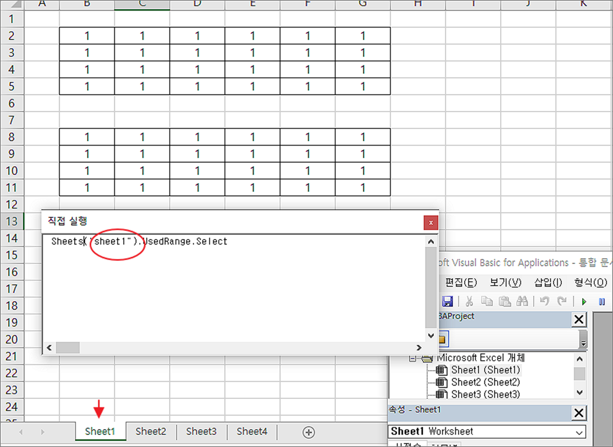 ▼ VBA 에서는 UsedRange 속성을 이용해서 동일하게 동작하도록 만들 수 있습니다. 코드는 다음과 같습니다. 아래 코드를 직접실행창에 입력합니다. Sheets 개체에서 사용할 시트를 지정합니다.