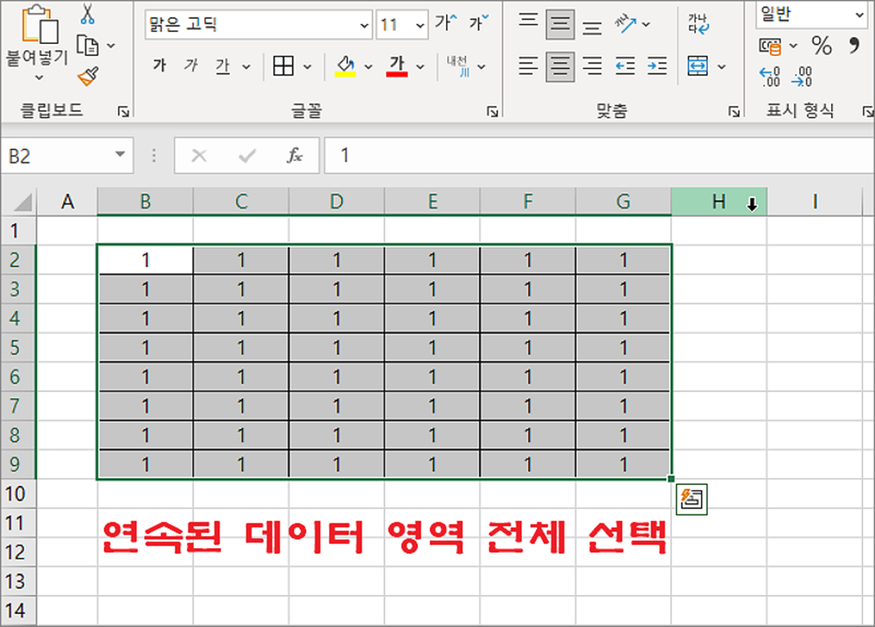 ▼ 단축키를 실행한 결과는 다음과 같습니다. 빈 공간을 무시하고 사용한 데이터 영역 끝까지 선택되었습니다.