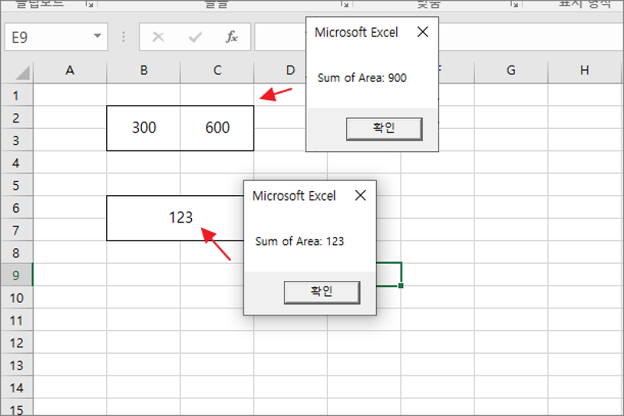 ▼ 이번에는 위와 달리 Range 함수에서 두 개의 영역을 지정했습니다. 이 경우 Areas 도 2개의 가집니다. 각각의 영역에 대한 값을 별도로 계산해서 팝업을 띄우는 소스입니다.