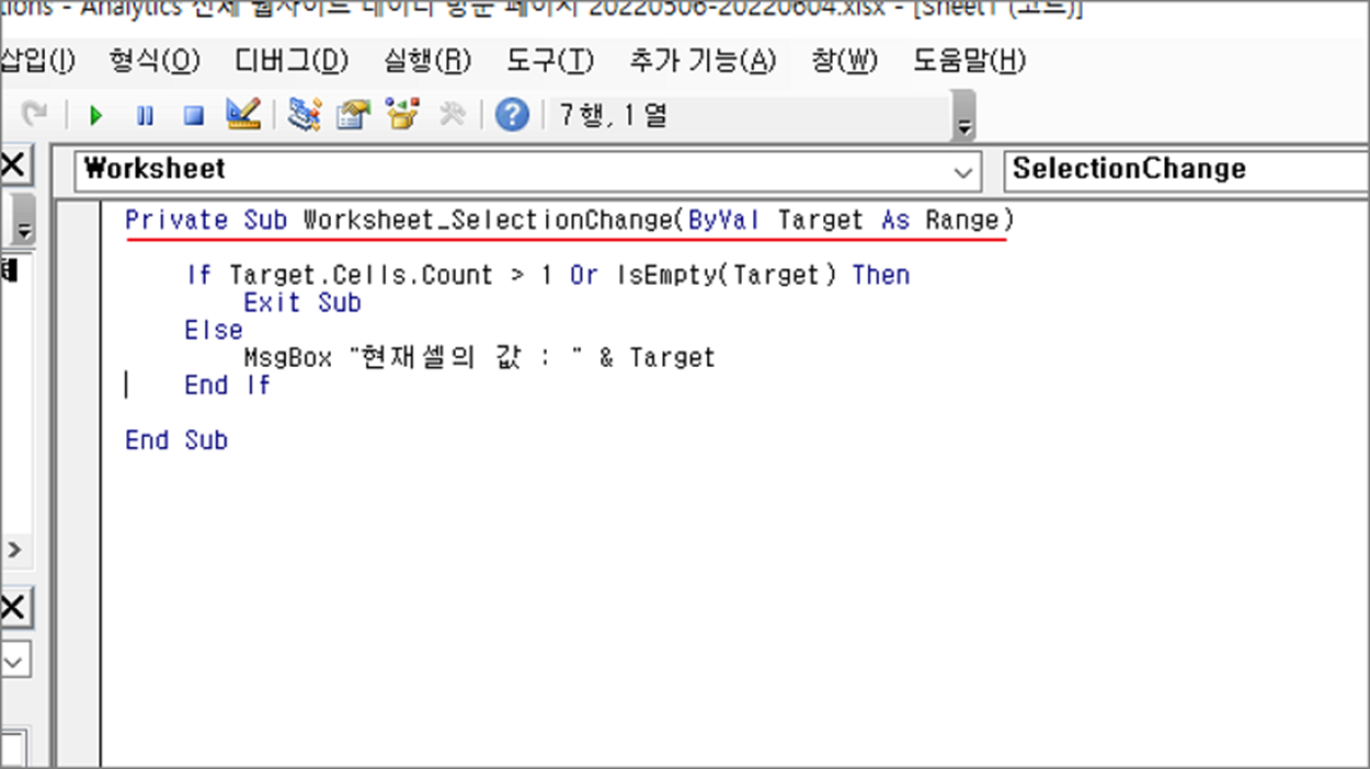 ▼ 에디터 화면에 함수가 생성되면 팝업창에 셀 값을 표시하는 소스를 추가합니다. 아래 소스는 인수로 넘어온 Target 객체를 팝업창에 표시합니다. Target 이 바로 셀에 들어가 있는 값입니다. If 함수로는 여러 셀을 드래그해서 선택했는지 여부를 체크하기 위한 용도입니다. 2개 이상의 셀을 선택했다면 if 로 걸러 냅니다. 선택한 셀 개수는 Target.Cells.Count 로 알 수 있습니다.
