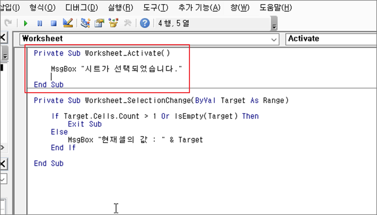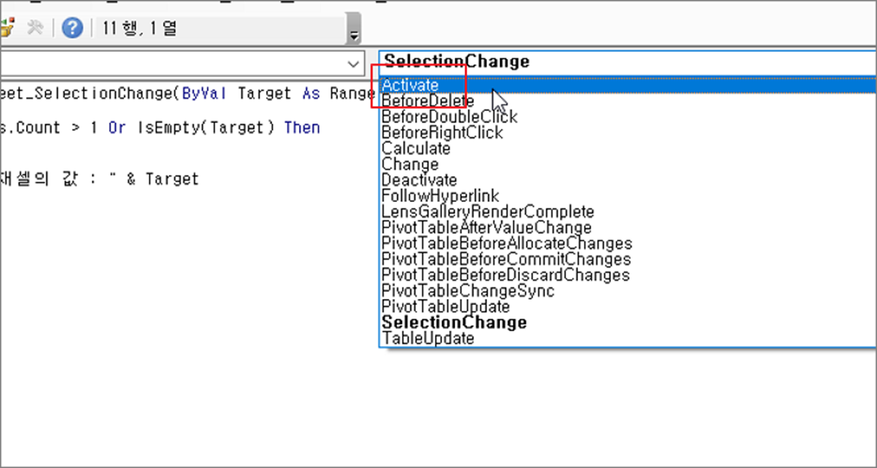 ▼ 두 번째는 워크시트가 활성화될 때 실행되는 이벤트를 구현해 보겠습니다. 이벤트 함수는 Activate 입니다. 오른쪽 콤보박스에서 Activate 를 선택하고 함수를 생성합니다.