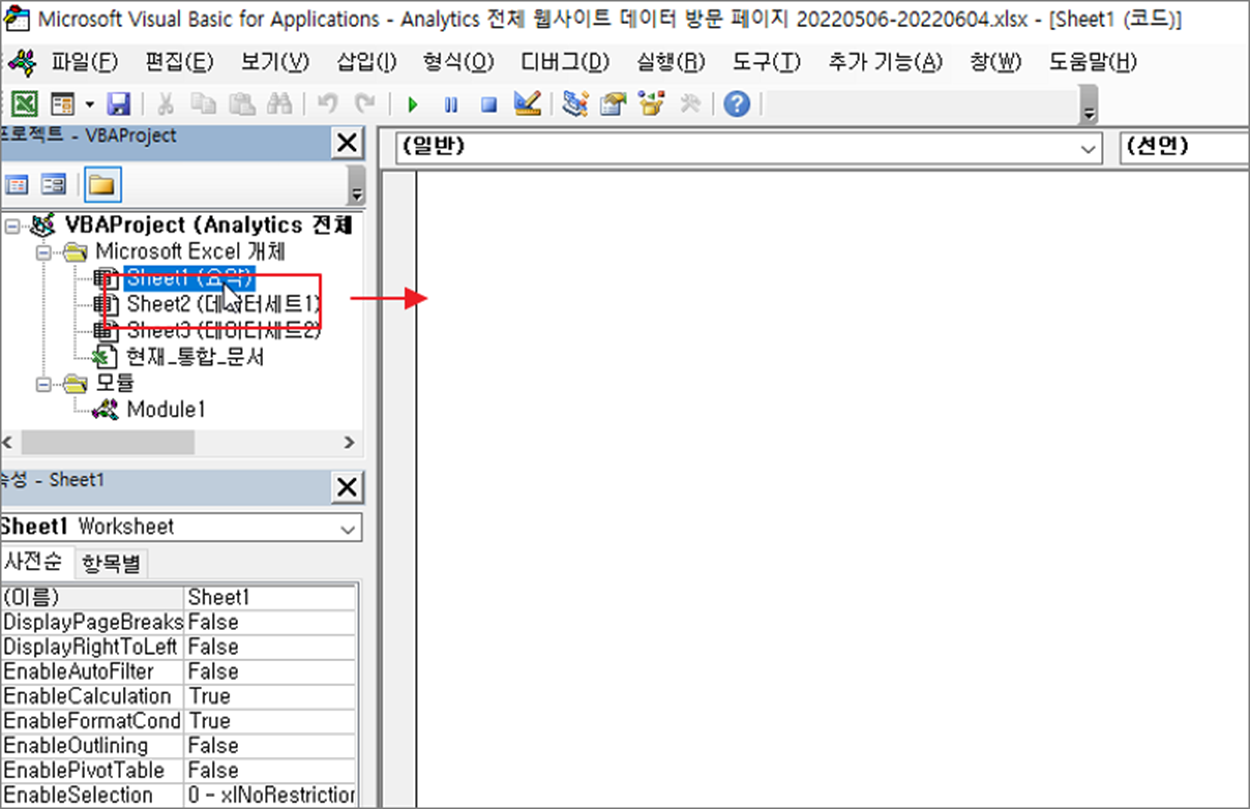 ▼ 왼쪽 사이드 탐색기에서 샘플을 구현할 시트를 더블 클릭합니다. 그리고 오른쪽 편집창으로 이동합니다.