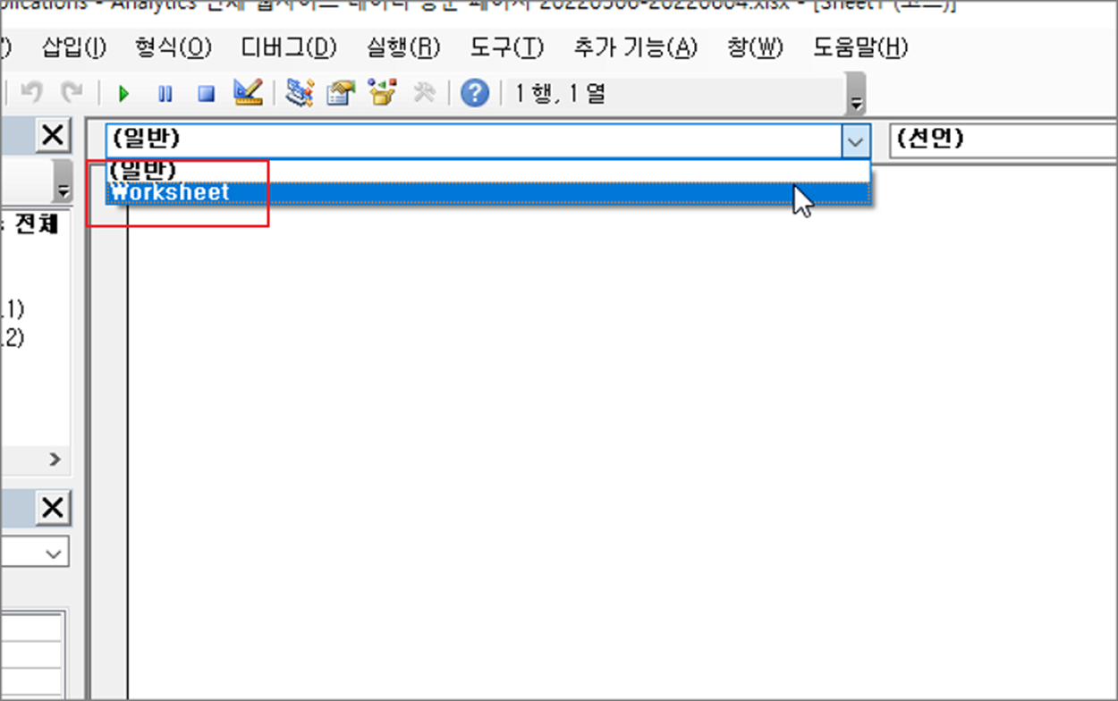▼ 셀 선택 이벤트 함수를 만들기 위해 왼쪽 콤보박스에서 Worksheet 를 선택합니다. 현재 시트에는 다른 컨트롤들이 없기 때문에 Worksheet 만 보입니다.
