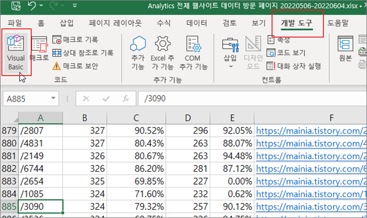 ▼ 먼저 VBA에서 셀을 선택했을 때 발생하는 이벤트를 통해 셀 값을 팝업창에 표시해 보겠습니다. VBA 편집 에디터를 띄우기 위해 개발 도구 > Visual Basic 리본 메뉴를 클릭합니다.