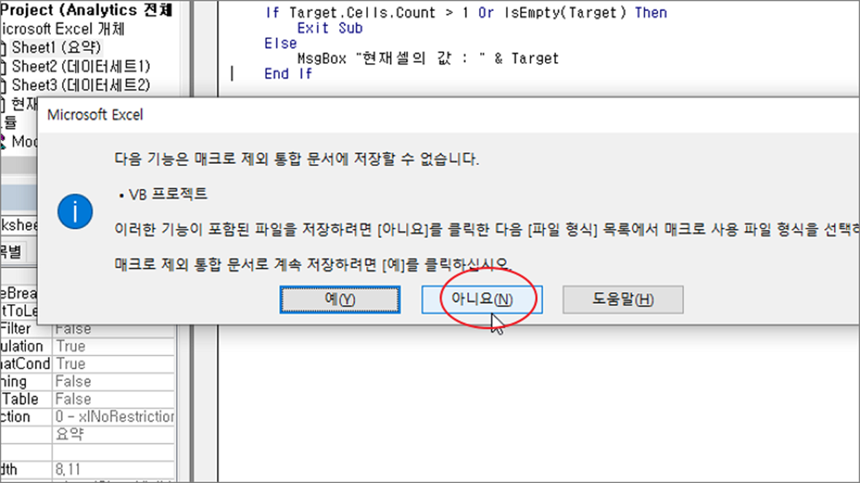 ▼ 이렇게 작업한 소스는 매크로에 해당하기 때문에 파일 확장자를 변경해서 저장해야 합니다. Ctrl + S 를 눌러 저장을 시도합니다. 그러면 화면에 매크로 파일 형식으로 저장할 것인지 묻습니다. 여기서 헷갈리시는 분들이 있는데 작성한 매크로 소스를 저장하기 위해서는 아니요 를 눌러야 합니다.