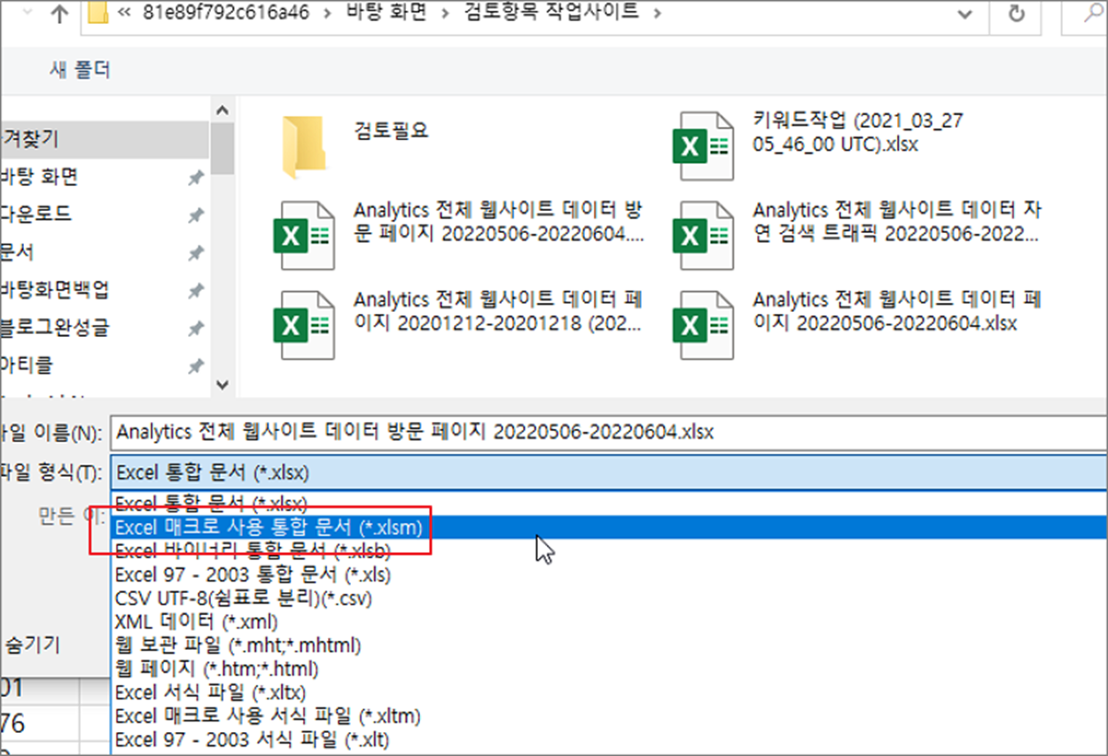 ▼ 화면에 파일 저장 대화상자가 뜨면 파일 형식을 매크로 소스 저장이 가능한 xlsm 으로 변경합니다.