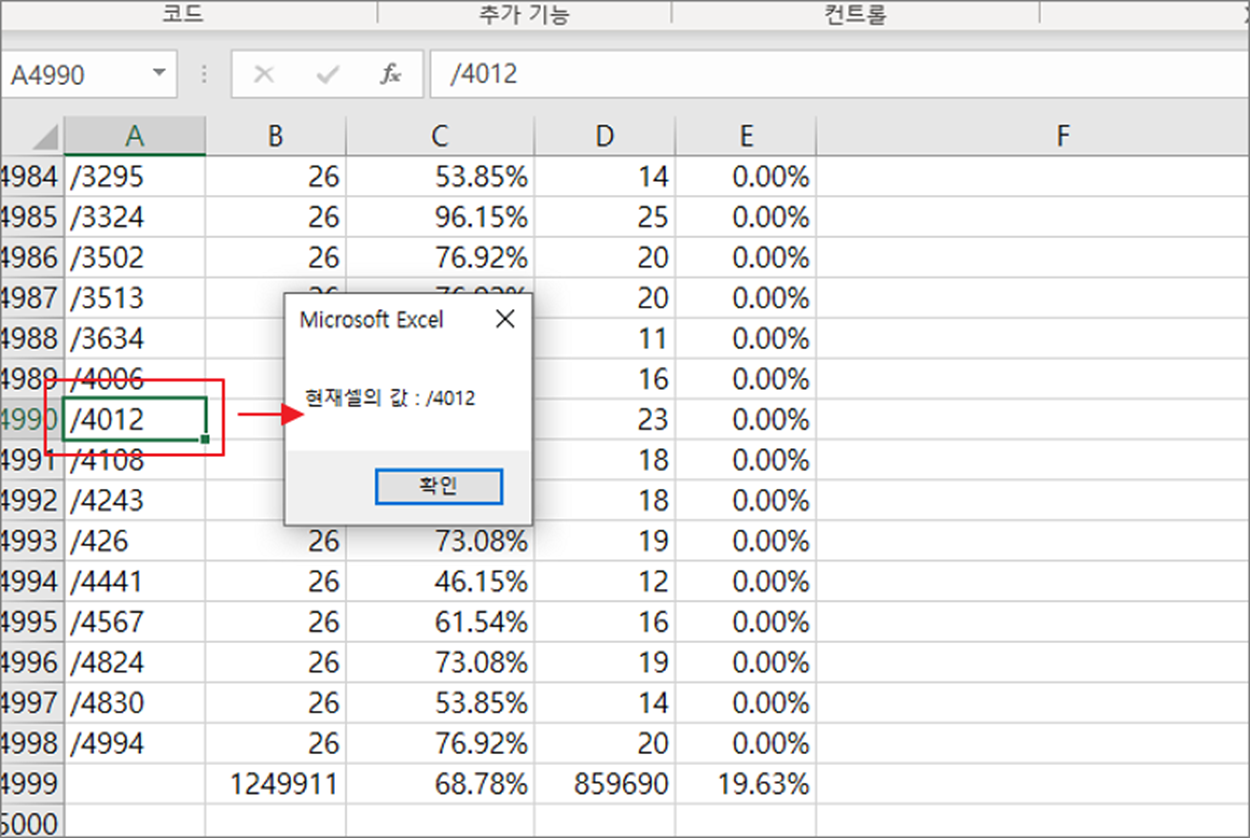 ▼ 이제 워크시트로 돌아가서 제대로 동작하는지 테스트해 봅니다. 셀을 선택하면 그림처럼 팝업창이 뜨면서 현재 선택한 셀 값을 표시할 겁니다.