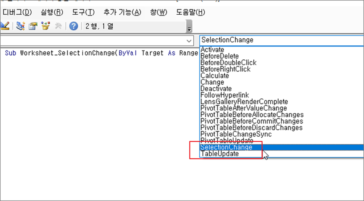 ▼ 다음은 이벤트 함수를 골라야 합니다. 셀 선택 이벤트 함수는 SelectChange() 입니다. 오른쪽상단 콤보박스에서 SelectionChange() 함수를 선택합니다.