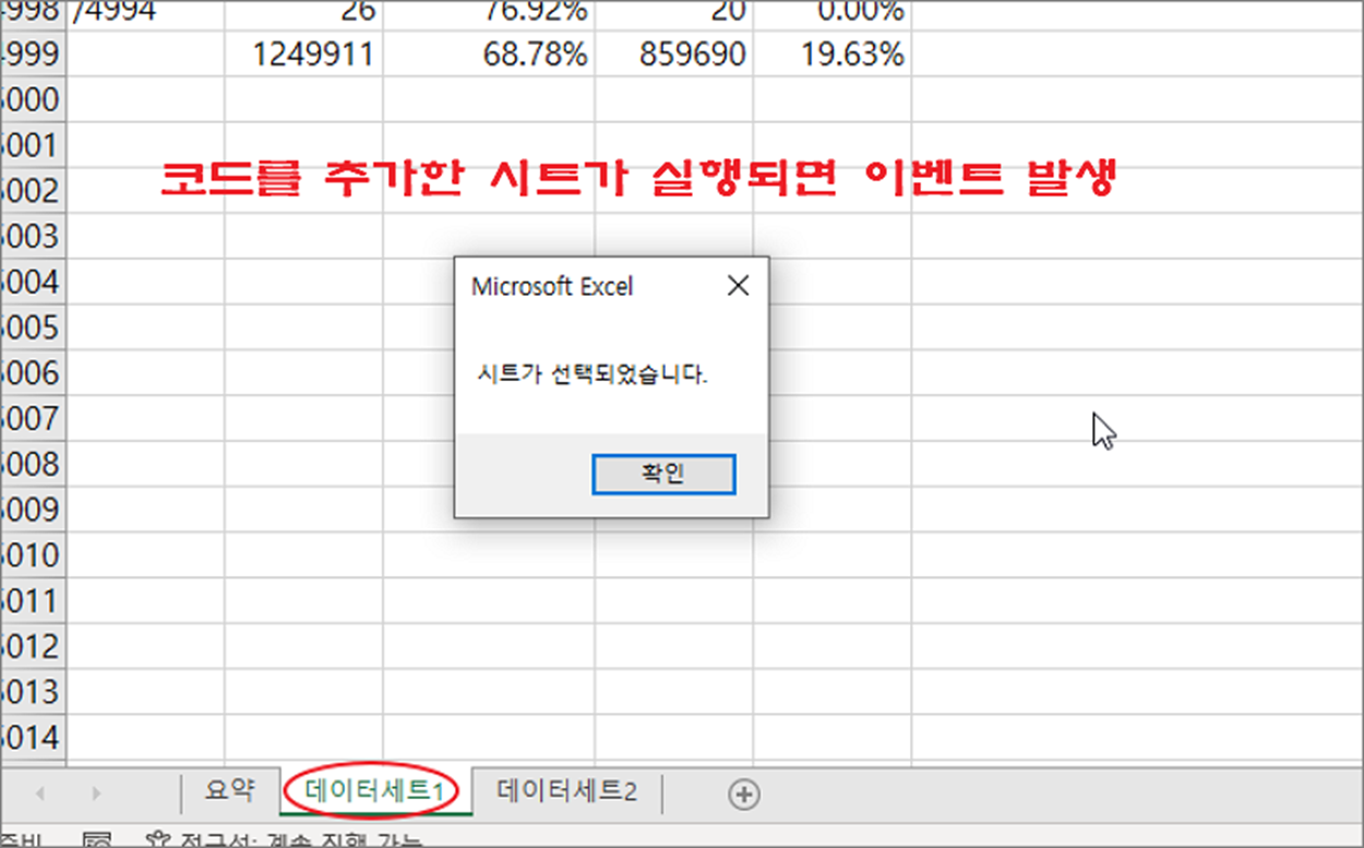 엑셀에서 워크시트가 활성화되는 순간과 셀이 선택되었을 때 발생하는 이벤트를 이용해서 팝업 창을 띄우는 예제를 구현해 보겠습니다. 해당 예제를 학습해 두었다가 자신의 상황에 맞게 응용해 보시기 바랍니다.