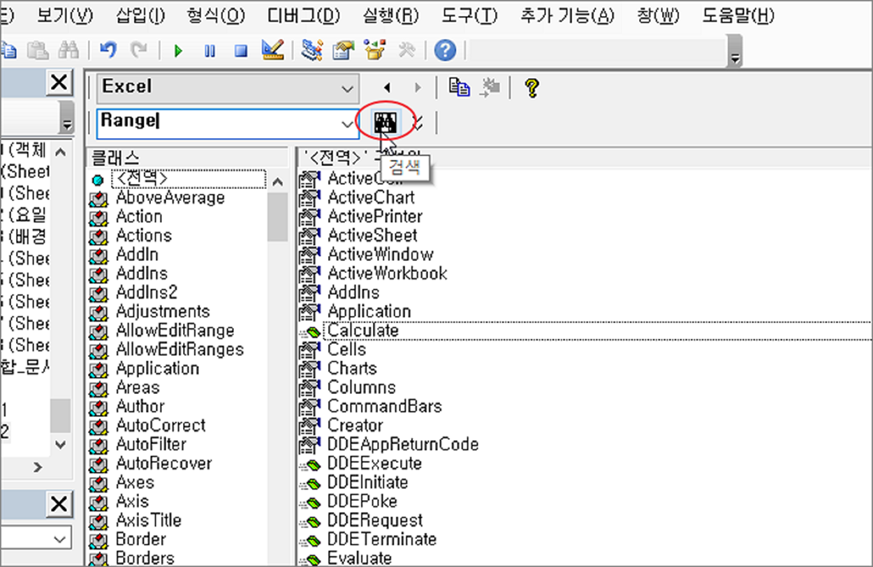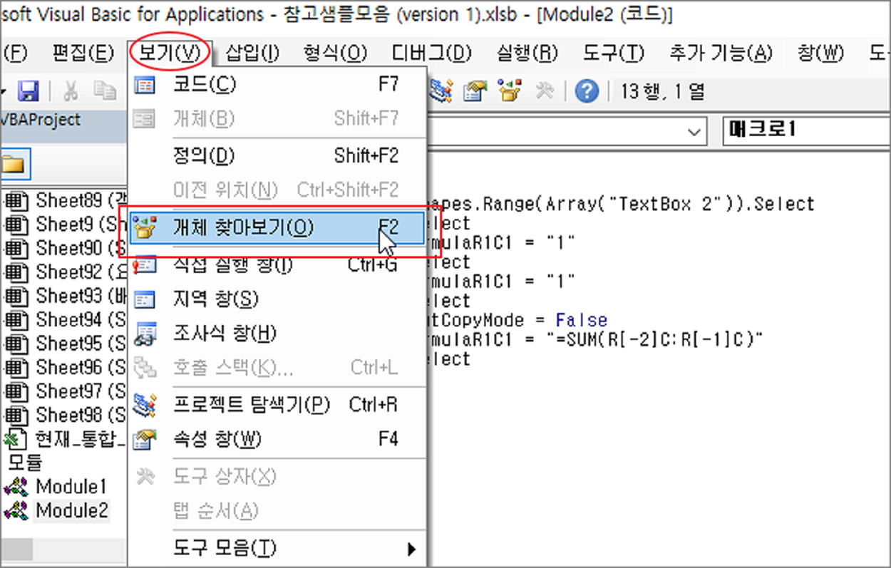 ▼ 마지막 방법은 “개체 찾아보기” 입니다. 엑셀은 버전업이 되는데 이부분만큼은 예전 초창기때 기능에서 크게 달라진 것이 없어서 불편할 수 있습니다. 보기 > 개체 찾아보기 메뉴나 F2 단축키를 눌러 창을 띄웁니다.