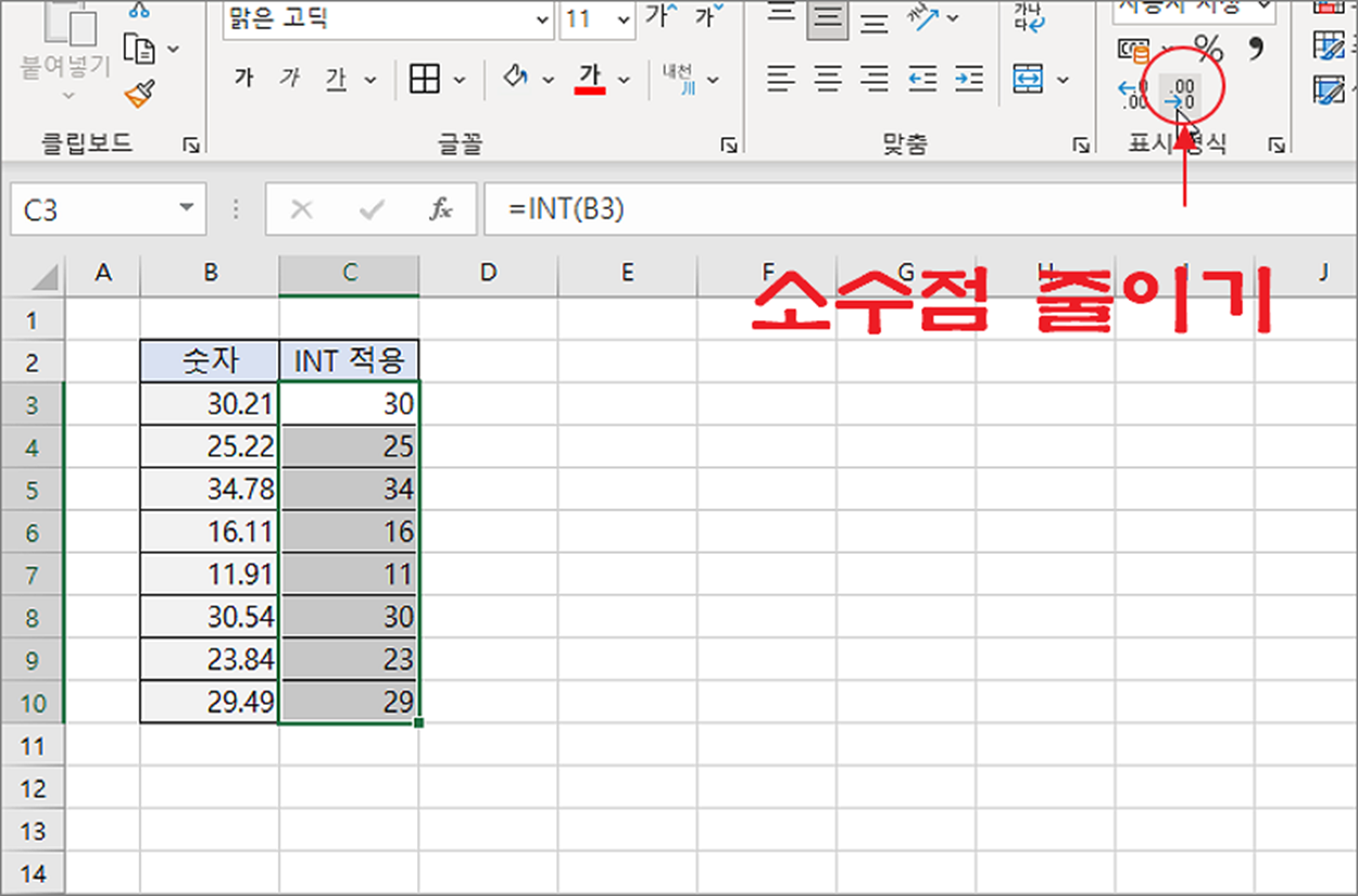 ▼ 결과는 다음과 같습니다. INT 함수를 적용한 것과 동일하기 모든 소수점이 제거되었습니다.