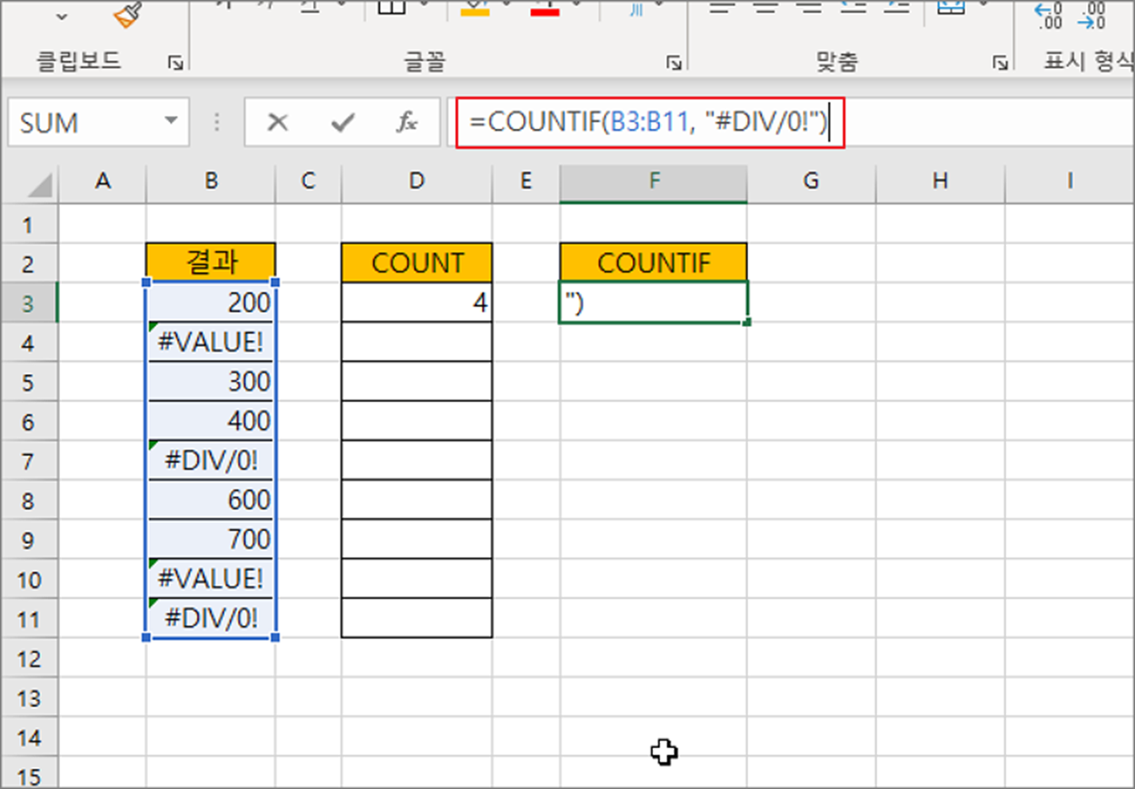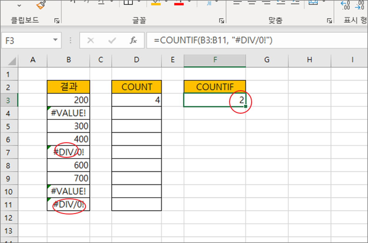 ▼ COUNT 는 매개변수에 입력한 영역에서 에러를 제외한 정상적인 데이터 개수만 계산합니다. 그럼 에러 개수는 어떻게 세야 할까요?