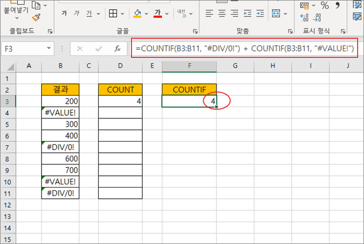 ◎ COUNT 함수 이용해서 에러 개수 세기 |