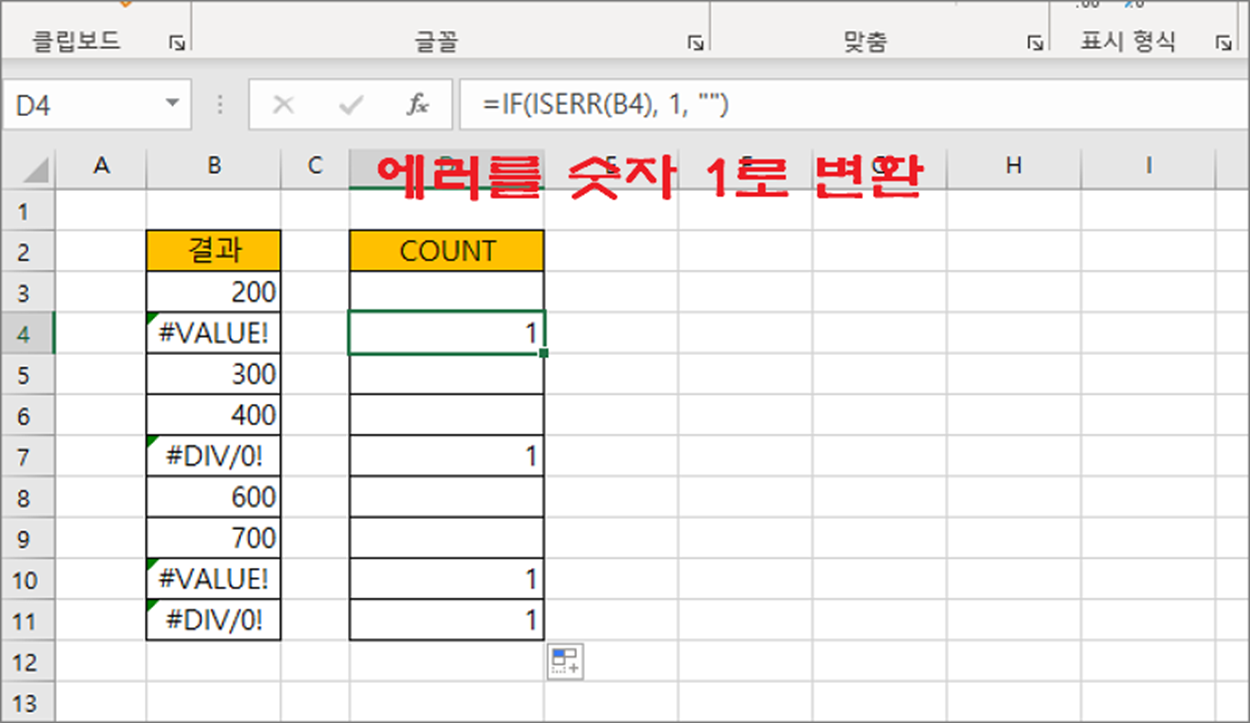▼ 이제 COUNT 함수와 IF, ISERR 함수를 합쳐서 에러 개수를 계산합니다.