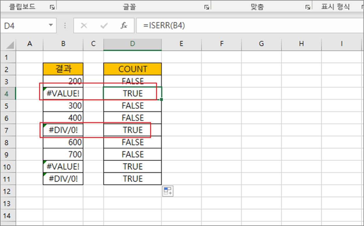 ▼ 먼저 에러 개수를 세기 전에 에러를 판단하는 함수를 알아야 합니다. ISERR 은 셀 데이터가 에러인 경우 TRUE 를 반환합니다.