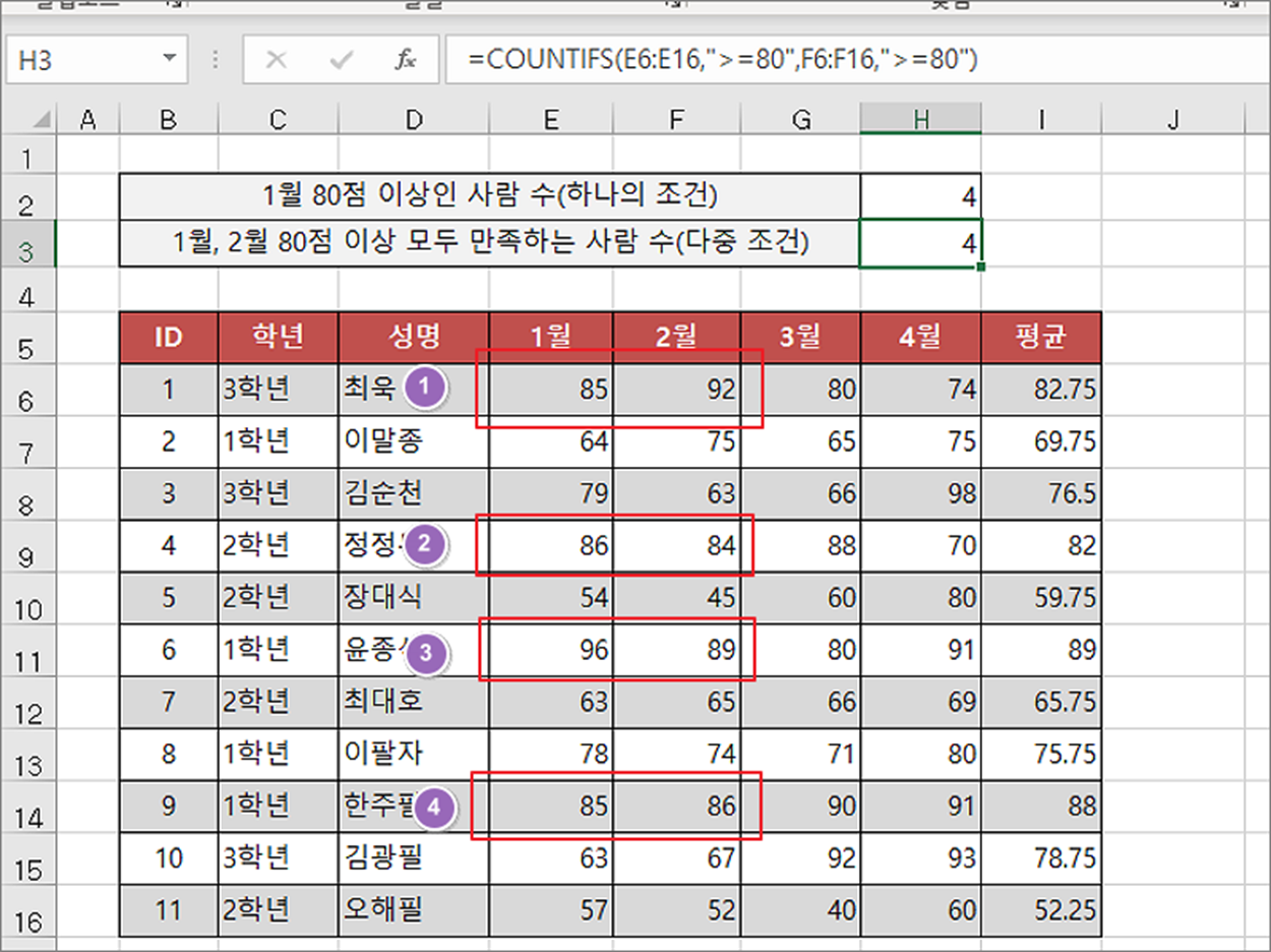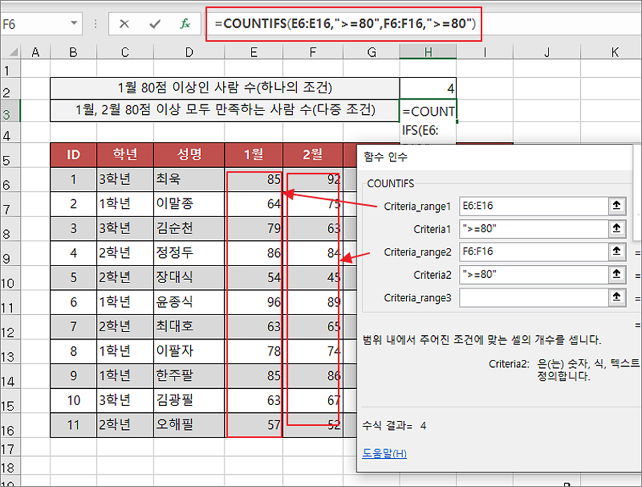 ▼ COUNTIFS 의 인수는 범위에 해당하는 Criteria_range 와 조건인 Criteria 이 쌍으로 계속해서 늘일 수 있습니다. 그러니까 254개의 반인 127개까지 쌍으로 조건을 계속해서 추가가 가능하다는 의미입니다. 샘플에서는 2개의 조건인 1월 80점 이상, 2월 80점 이상으로 함수를 구성했습니다.
