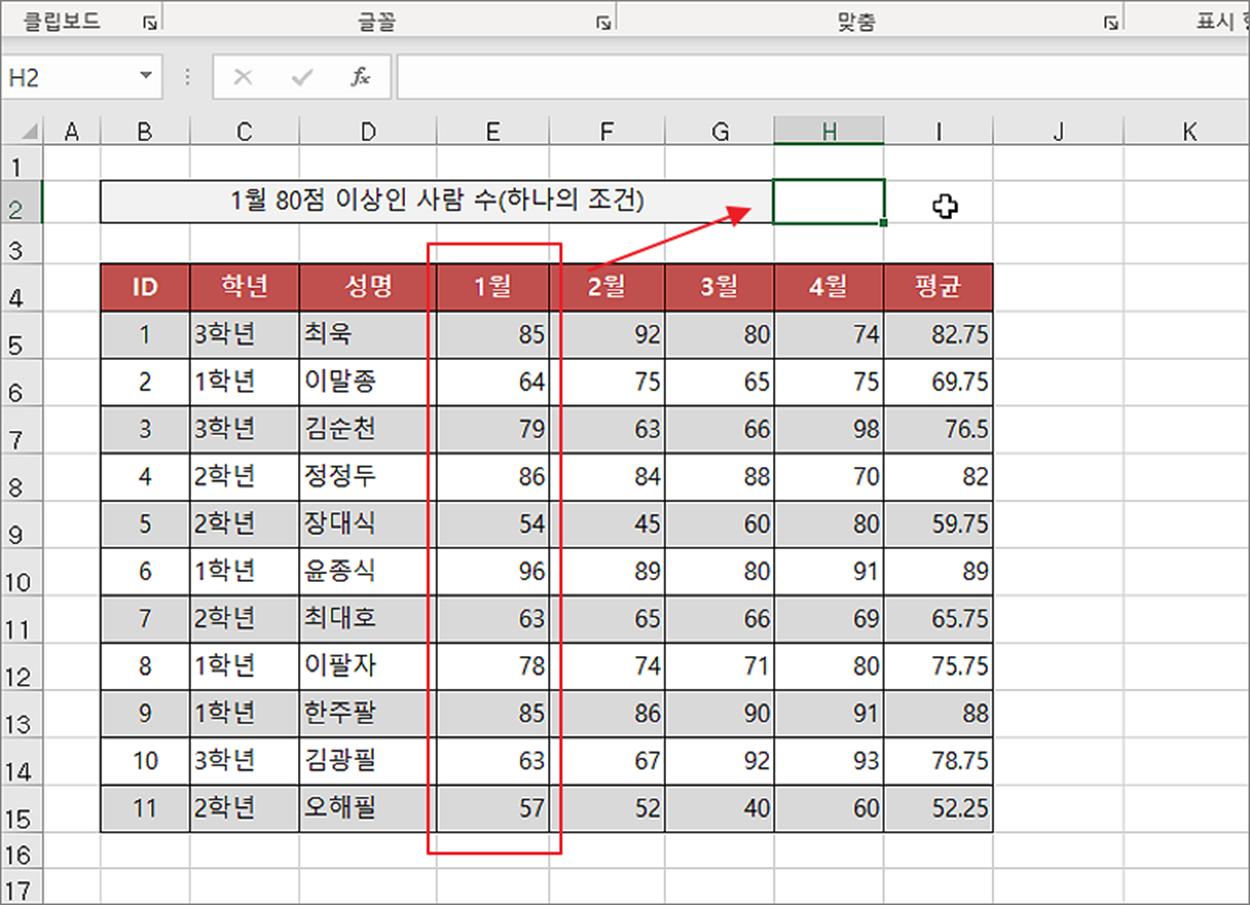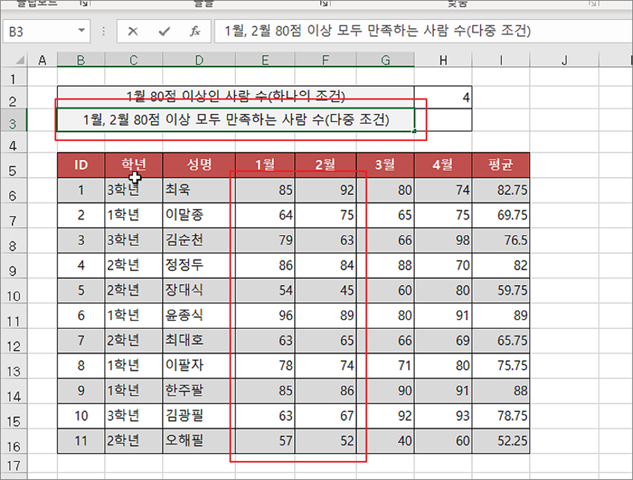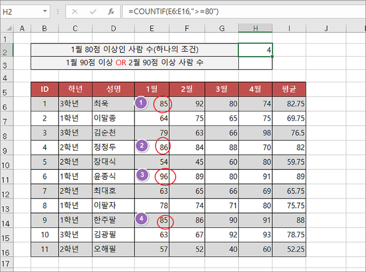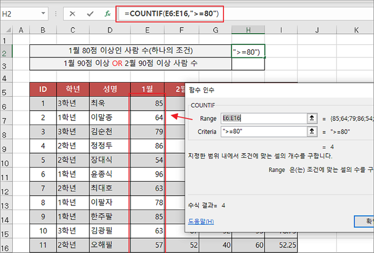 ▼ 함수를 실행한 결과는 다음과 같습니다. 1월달에 80점 이상 받은 사람은 총 4명입니다.