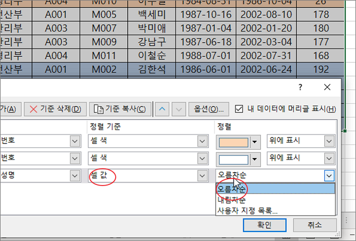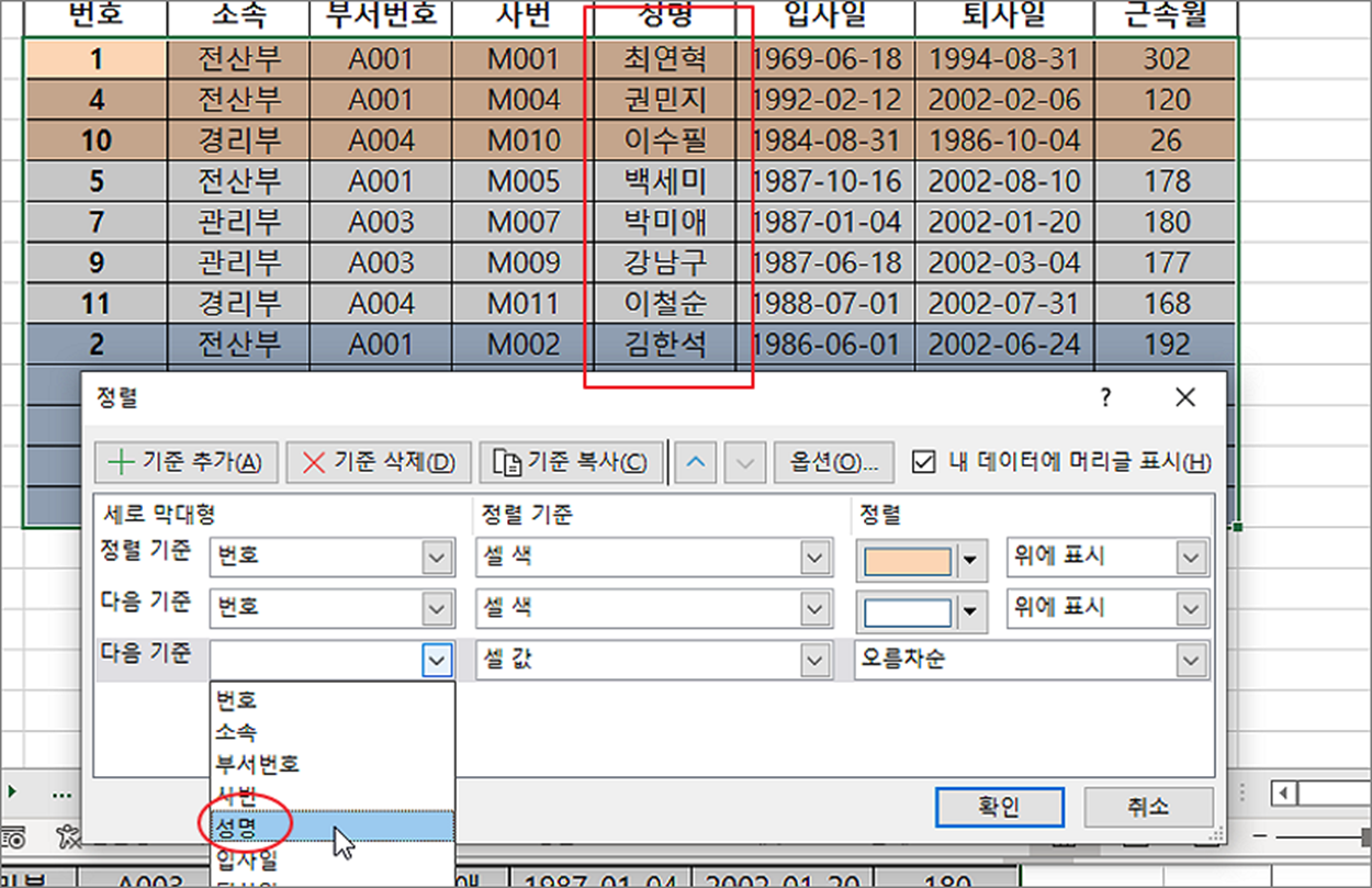 ▼ 정렬한 셀 색은 그대로 둔 채 내부에 데이터를 오름차순/내림차순으로 정렬하는 방법입니다. 정렬 기준을 “성명” 으로 할 것입니다. 정렬 창을 띄운 후 기준 추가 버튼을 눌러 기준을 하나 더 생성합니다. 그리고 정렬할 열로 “성명” 을 선택합니다.