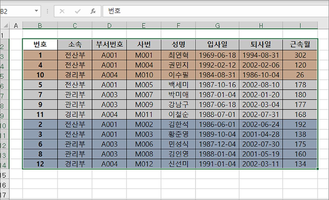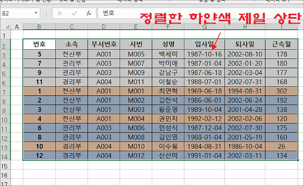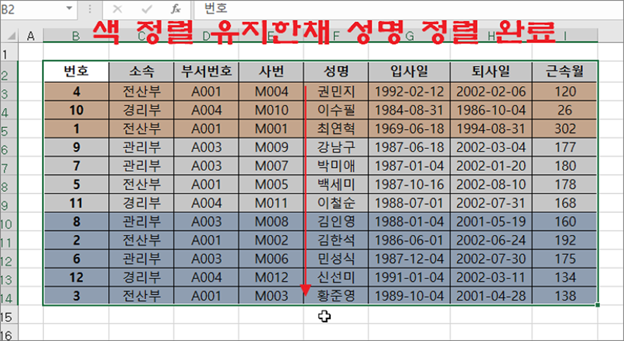 ▼ 다중 정렬 결과는 다음과 같습니다. 정렬 기준 순서에 맞게 셀 색으로 정렬한 데이터는 그대로 유지한채 내부에 이름을 오름차순으로 한 번 더 정렬에 성공했습니다.