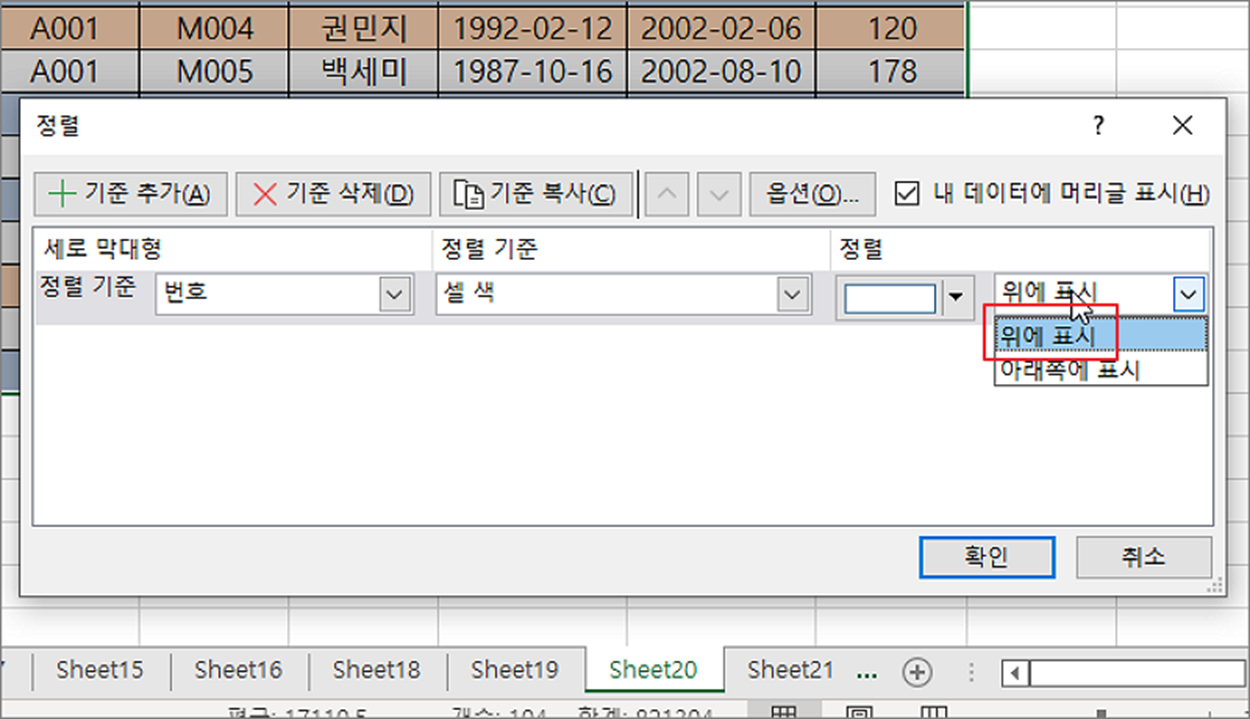▼ 마지막으로 정렬 위치를 지정해야 합니다. 제일 위쪽과 아래쪽에서 하나를 선택해야 합니다. 제일 위쪽에 표시하는 위에 표시를 선택하겠습니다.