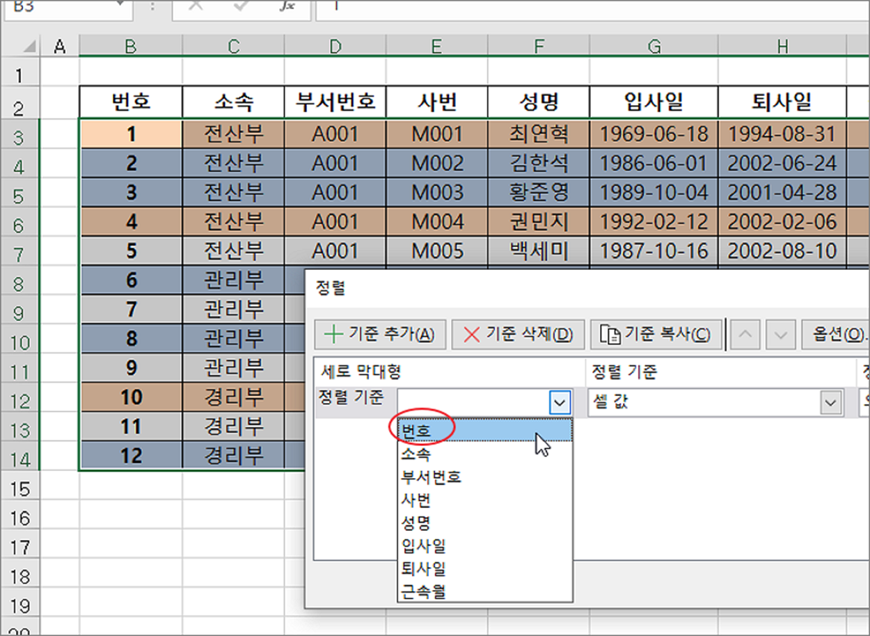 ▼ 다음은 정렬 대화상자에서 정렬할 기준이 되는 열을 선택합니다. 행 전체에 색이 동일하다면 아무 열이나 선택합니다.