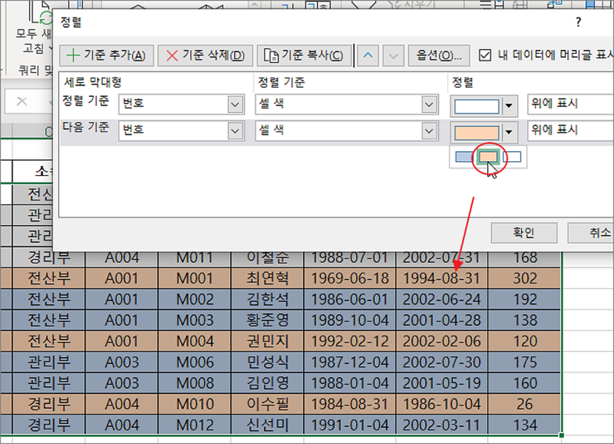 ▼ 기존 정렬한 기준에서 색상을 바꿔보겠습니다. 화면에 표시한 두 색을 바꾸기 위해서는 어떻게 해야 할까요?