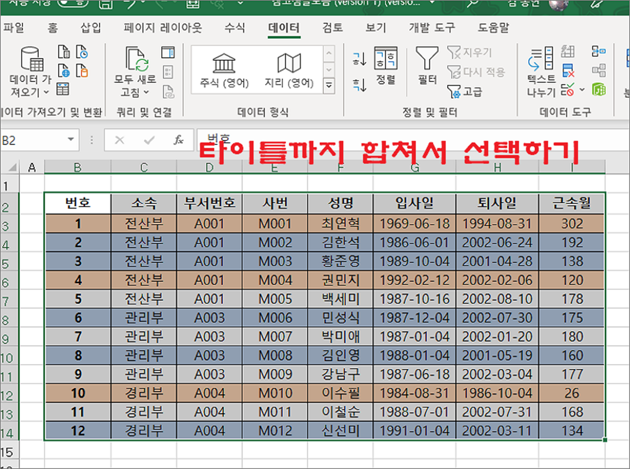 ▼ 엑셀에서 데이터를 정렬하기 위해서는 정렬 기능을 이용합니다. 먼저 정렬할 데이터 영역을 타이틀 포함해서 선택합니다. 그리고 데이터 탭 > 정렬 및 필터 > 정렬 리본 메뉴를 클릭합니다.