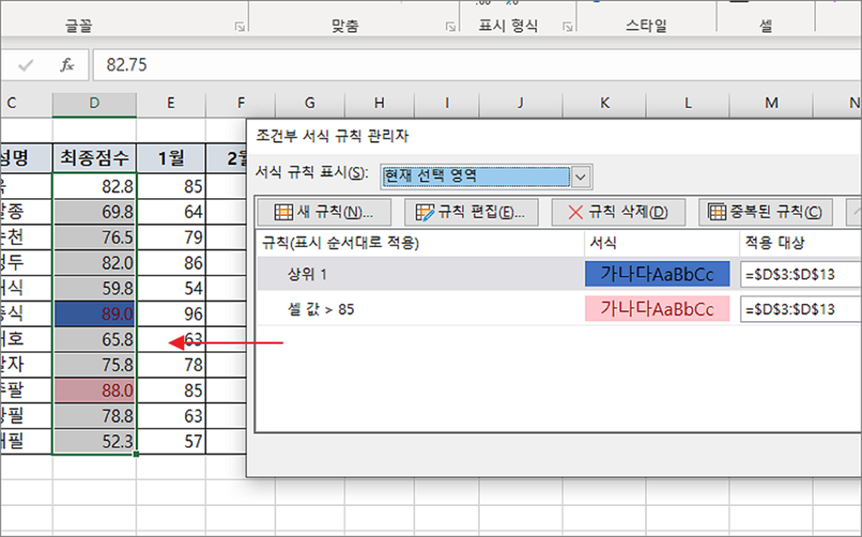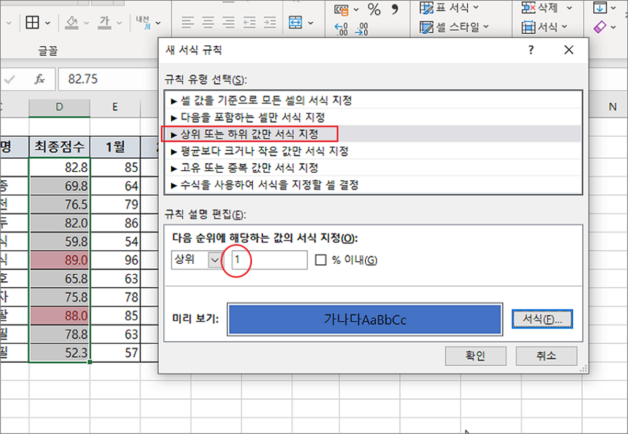▼ 다음은 찾은 두 값에 또 다른 조건부 서식을 만들어서 적용해 보겠습니다. 두 개의 조건부 서식이 적용되면 어떻게 될까요? 조건부 서식 > 새 규칙으로 가서 상위 1 개를 찾는 조건부 서식을 만들 것입니다. 그러면 위에서 찾은 두 개의 데이터 중 89.0 에 새로 만든 조건부 서식이 적용되겠죠. 과연 그렇게 되는지 알아보겠습니다.