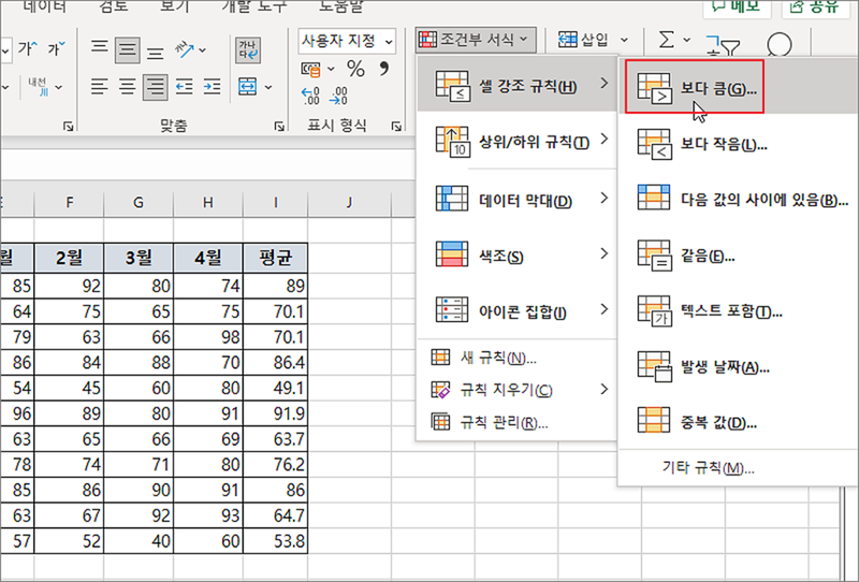 ▼ 첫 번째는 “최종 점수” 에서 85점 이상인 데이터를 찾는 조건입니다. 조건부 서식 > 셀 강조 규칙 > 보다 큼 메뉴를 선택합니다.