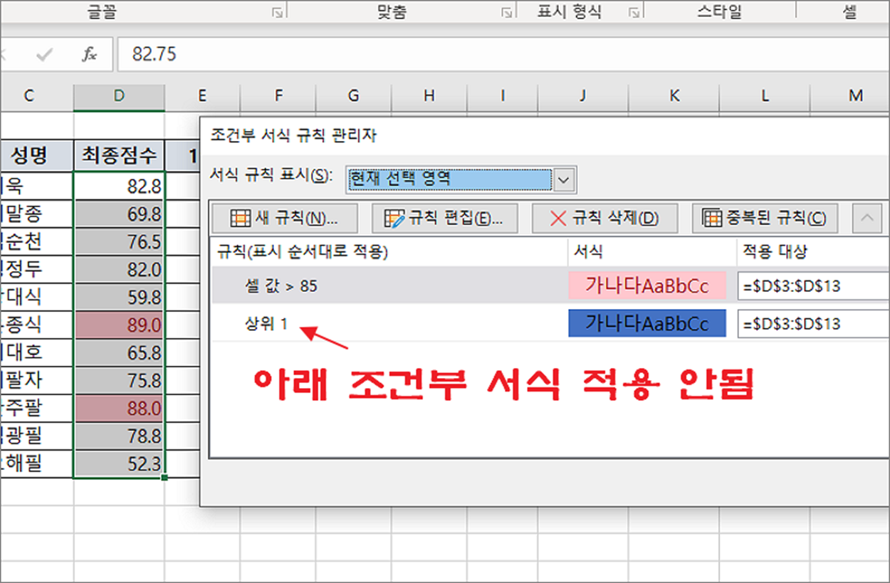 ▼ 2개의 조건부 서식을 적용한 결과 아래 “상위 1” 은 적용이 안되었습니다. 이유는 순서 때문입니다. 상단 규칙 설명에 보시면 “표시 순서대로 적용” 이라고 되어 있습니다. 만약 아래 조건을 적용하고 싶다면 순서를 바꿔서 위로 올려야 합니다.