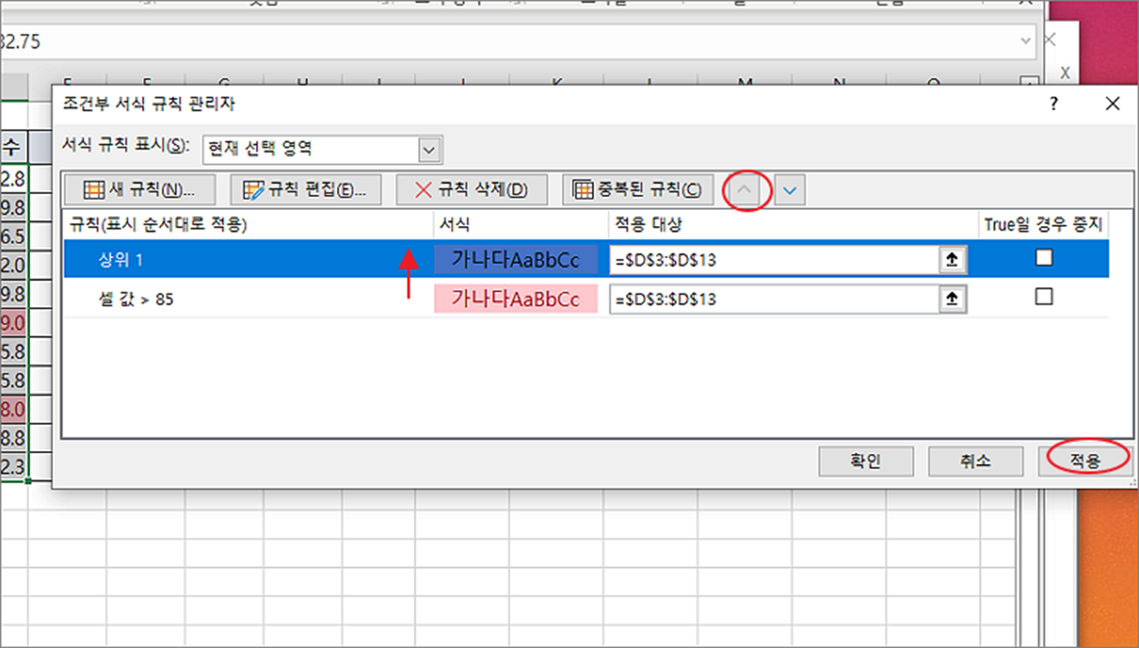 ▼ 조건부 서식 규칙 관리자에서 상단에 화살표를 눌러 아래에 있던 “상위 1” 을 위로 올립니다. 그리고 오른쪽 하단에 “적용” 버튼을 클릭합니다.