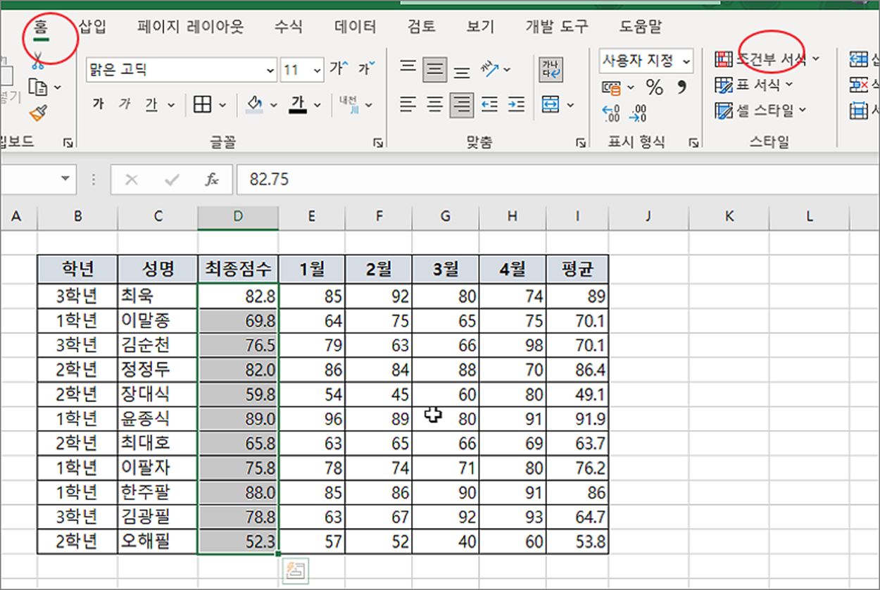 ▼ 최종 점수 영역에서 원하는 데이터를 찾기 위해 2개의 “조건부 서식” 조건을 만들어 보겠습니다. 홈 탭 > 스타일 그룹 > 조건부 서식 리본 메뉴를 클릭합니다.
