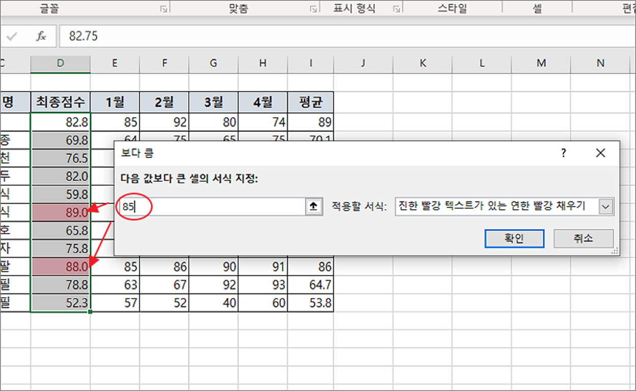 ▼ 보다 큼 창에서 85를 입력하면 선택한 영역의 데이터에서 해당하는 값의 셀에 “적용할 서식” 을 표시합니다.