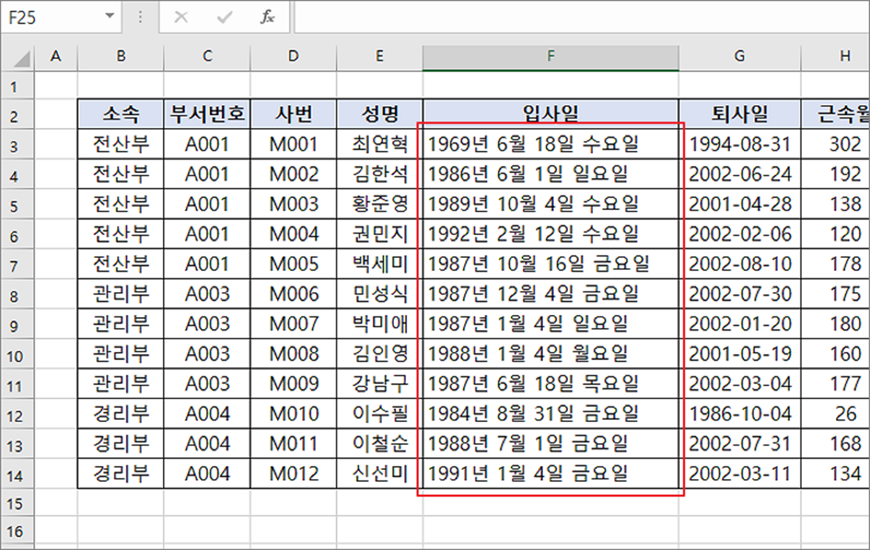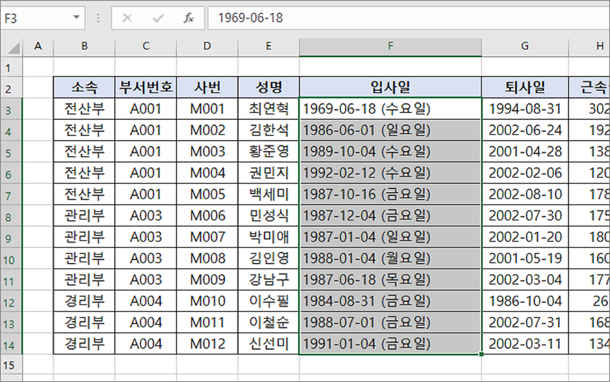 ▼ 셀 서식의 날짜 형식을 적용한 결과는 다음과 같습니다.