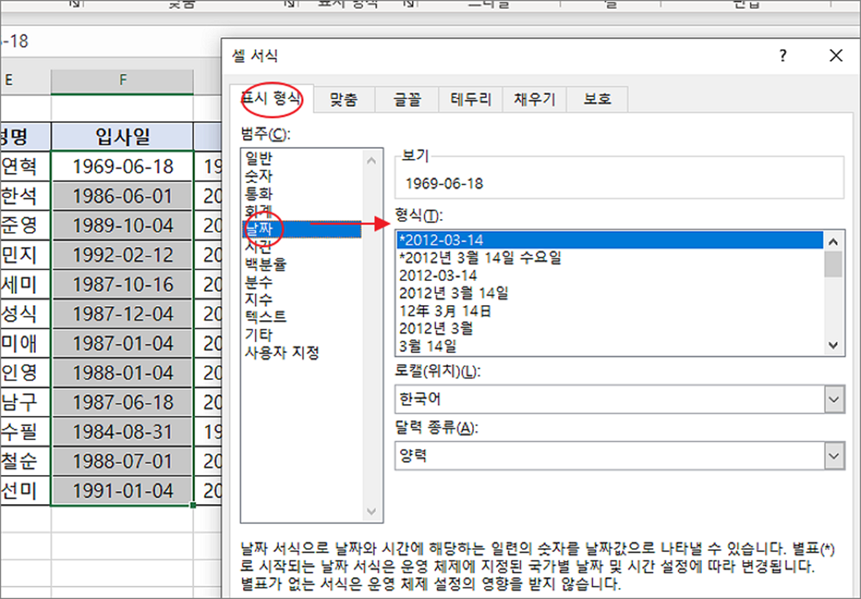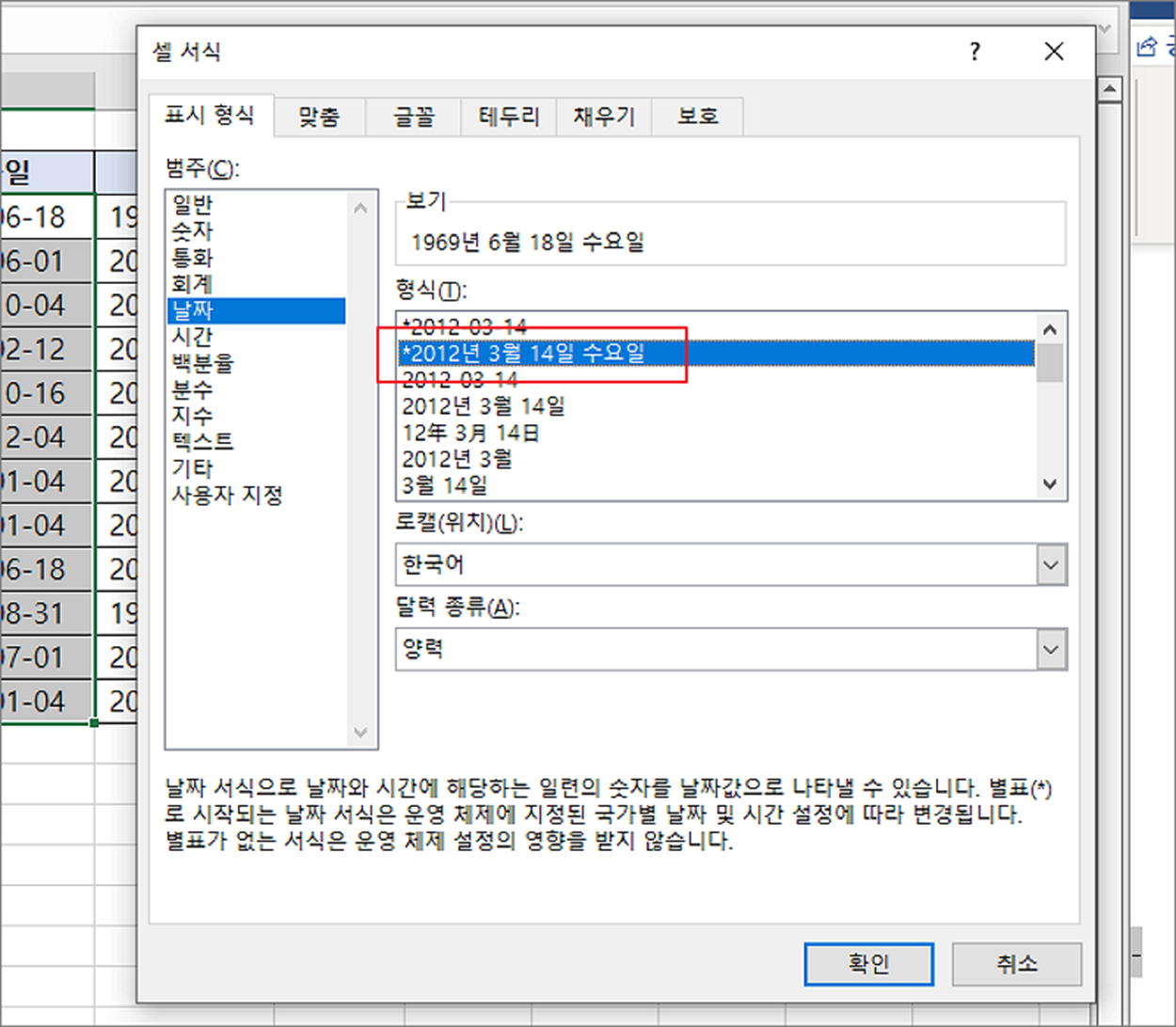 ▼ 날짜 형식 목록에서 요일이 표시된 항목을 찾아서 선택합니다. 요일이 표시된 형식은 아래와 같습니다. 기존 날짜 형식을 변경해서 “년”, “월”, “일” 을 붙여야 합니다.