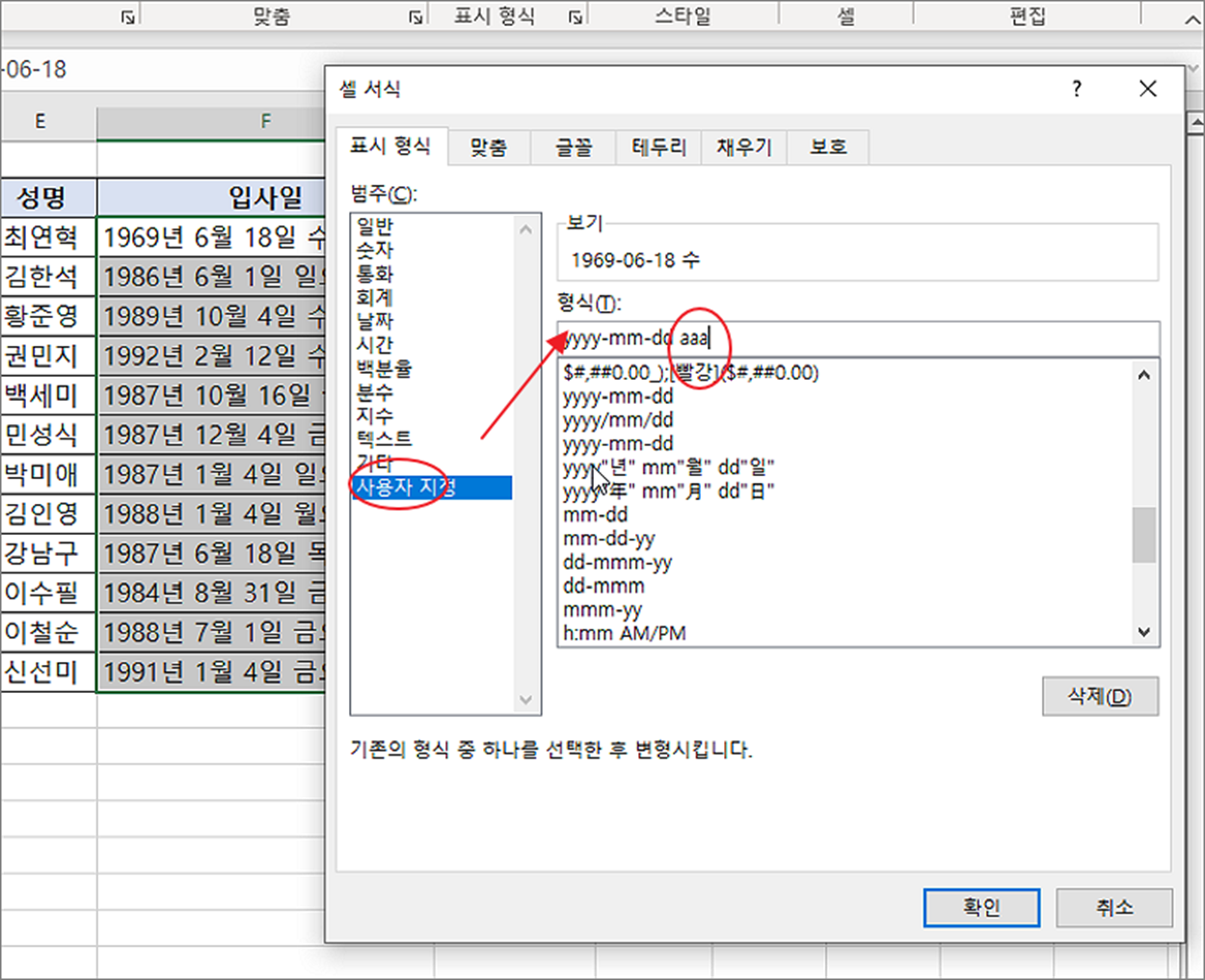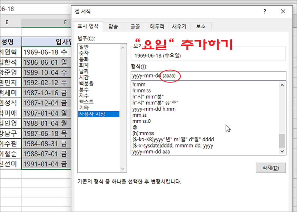 ▼ 다음은 기존 날짜 형식은 그대로 유지한 채 요일을 추가하는 방법입니다. 표시 형식의 사용자 지정에서 기호를 이용할 것입니다. 날짜와 관련된 기호는 화면 제일 하단에 있으니 참고하시기 바랍니다. 표시 형식의 범주에서 사용자 지정을 선택합니다. 형식에서 기존 날짜와 동일한 것을 찾아 선택하고 뒤에 요일을 나타내는 기호 aaa 를 추가합니다.