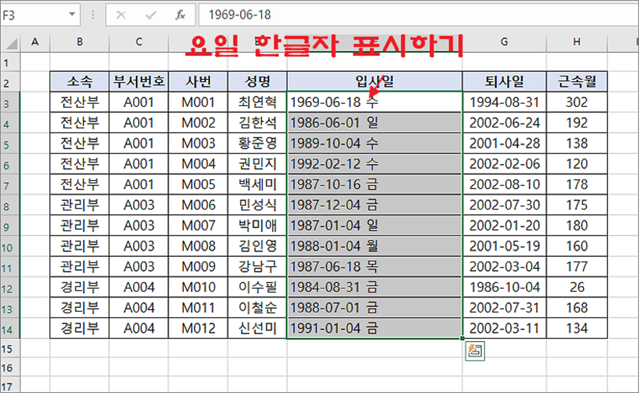 ▼ 기호 aaa 는 “요일” 을 제외한 한글자만 표시합니다. 사용자 지정 서식을 적용한 결과는 다음과 같습니다.