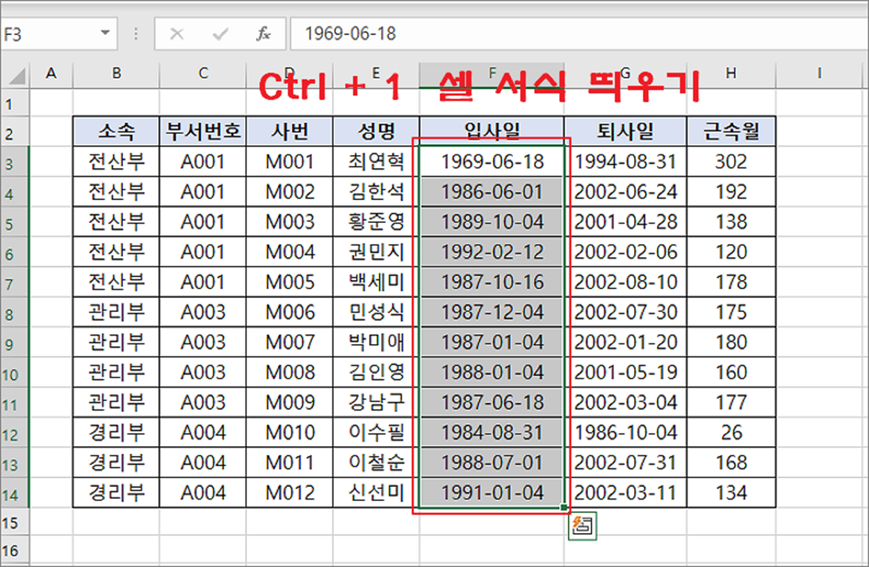 ▼ 먼저 셀 서식의 날짜 범주에서 요일을 표시하는 방법입니다. 편집을 위해 날짜 데이터 영역을 모두 선택합니다. 그리고 셀 서식 창을 띄우기 위해 Ctrl + 1 단축키를 클릭합니다.