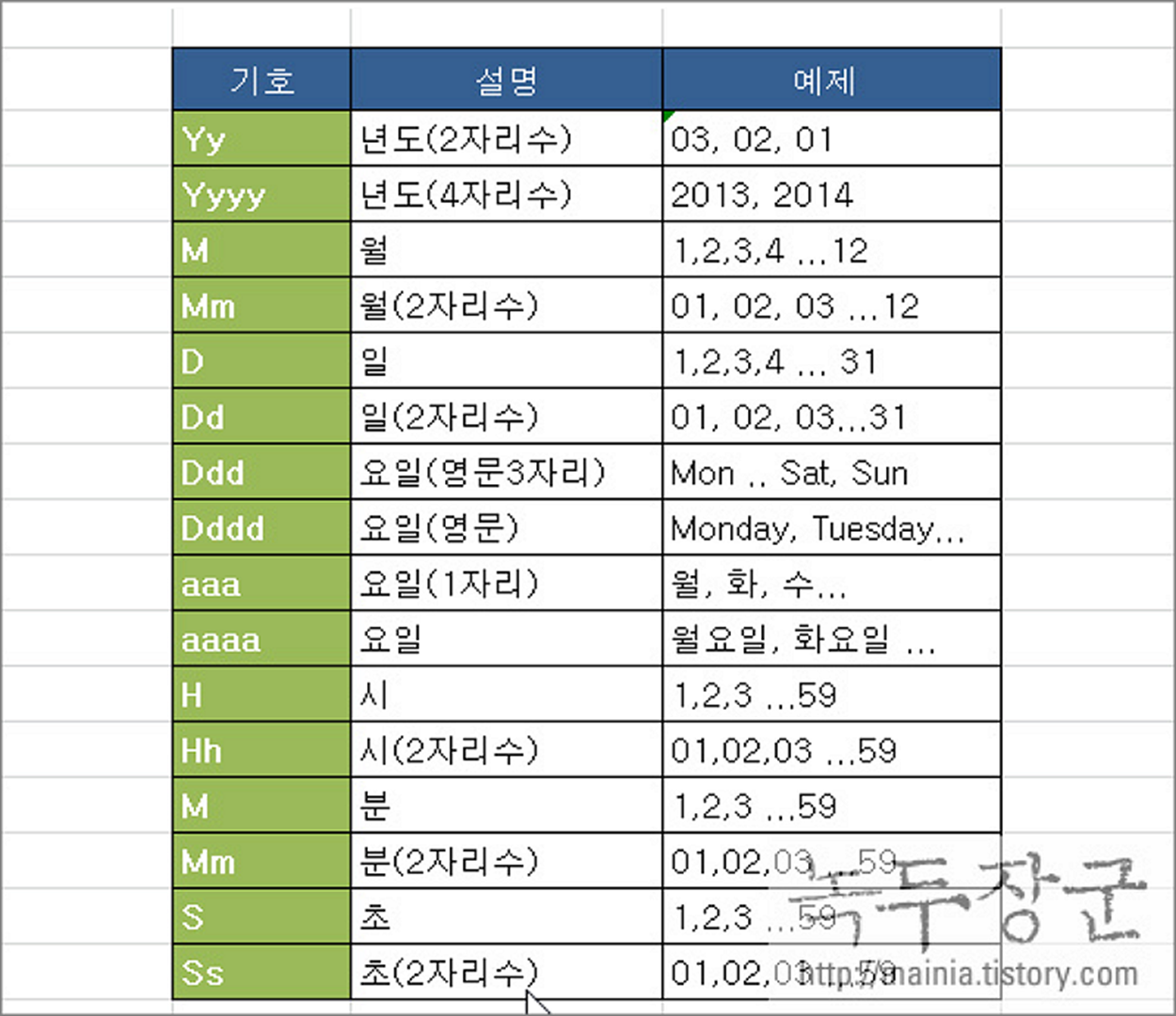 ▼ 날짜와 관련된 기호는 아래와 같습니다. 사용자 정의에서 날짜를 원하는 형태로 꾸미고 싶을 때 참고하세요.