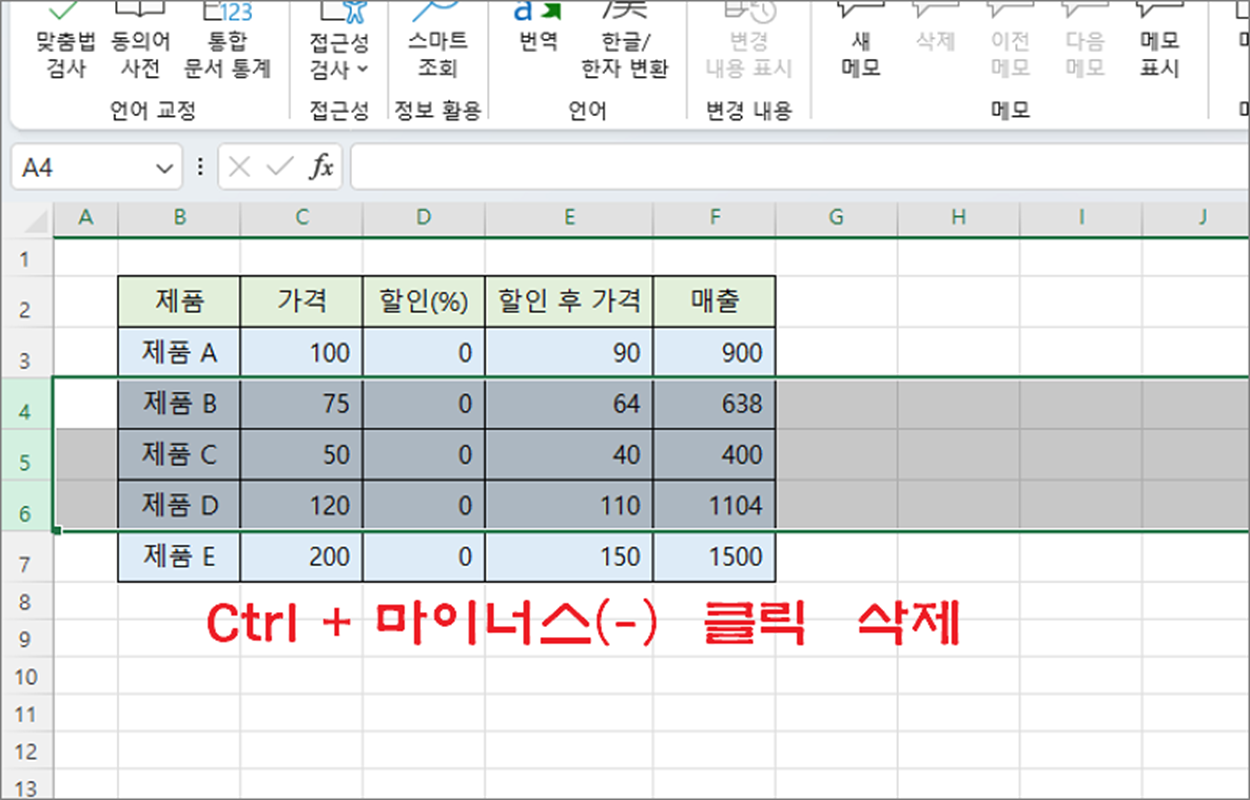 ▼ 이전에 생성한 열을 삭제해 보겠습니다. 삭제하고 싶은 행과 열을 전체 선택한 뒤 단축키 Ctrl + 마이너스 키를 동시에 클릭합니다. 경고창 없이 바로 삭제가 가능합니다.