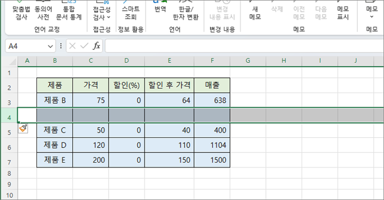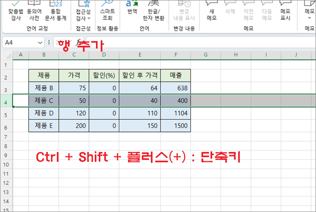 ▼ 단축키를 클릭한 결과 선택한 행 바로 위에 새로운 행을 추가했습니다.