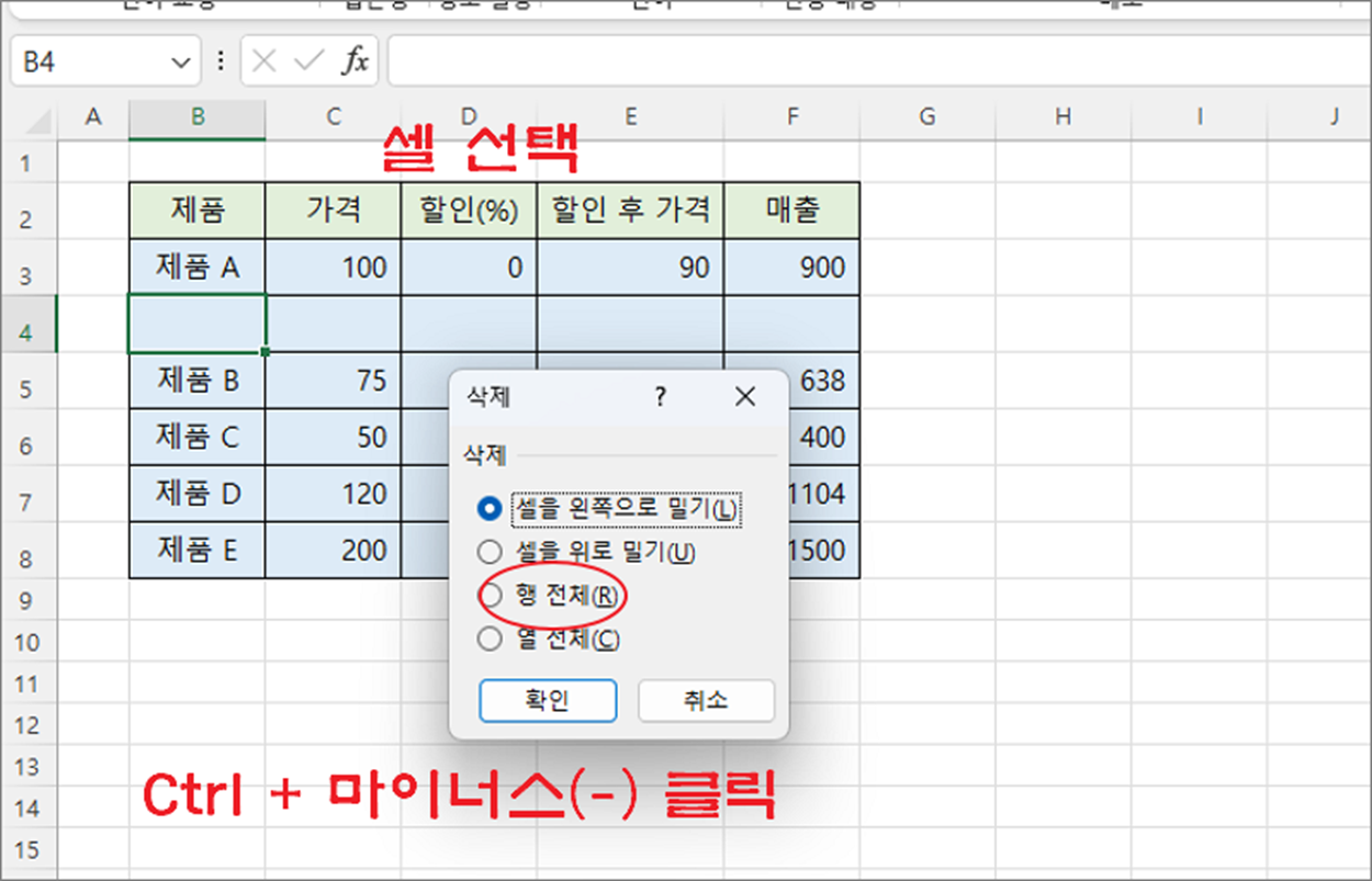▼ 삭제 단축키도 마찬가지입니다. Ctrl + 마이너스 키를 누르면 삭제 여부를 묻는 팝업창이 뜹니다. 여기에서도 행 이나 열 중 하나를 선택해서 삭제를 진행합니다.
