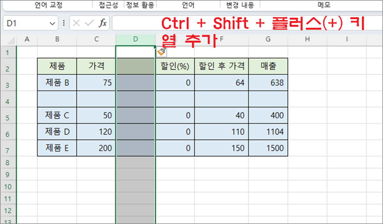 ▼ 열도 마찬가지입니다. 상단 알파벳 탭을 클릭해서 열 전체를 선택하고 Ctrl + Shift + 플러그 키를 한 번에 누릅니다. 화면에는 새로운 열이 생성되었습니다.