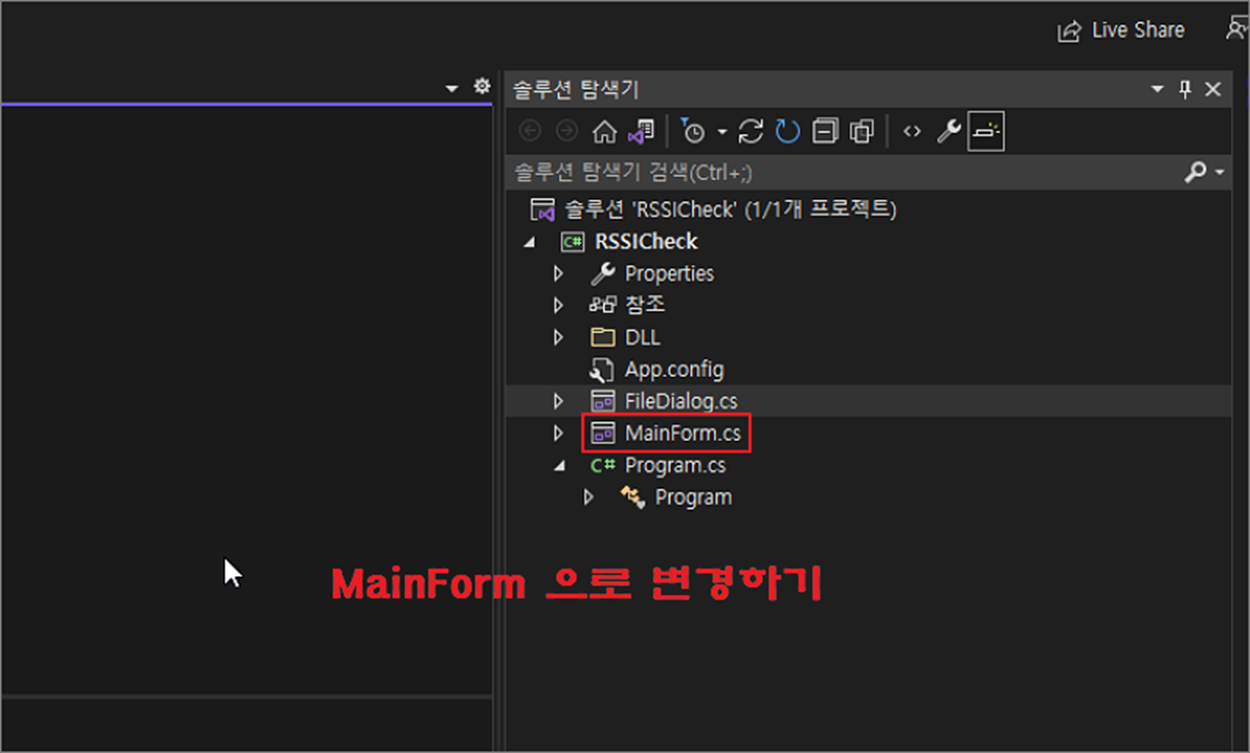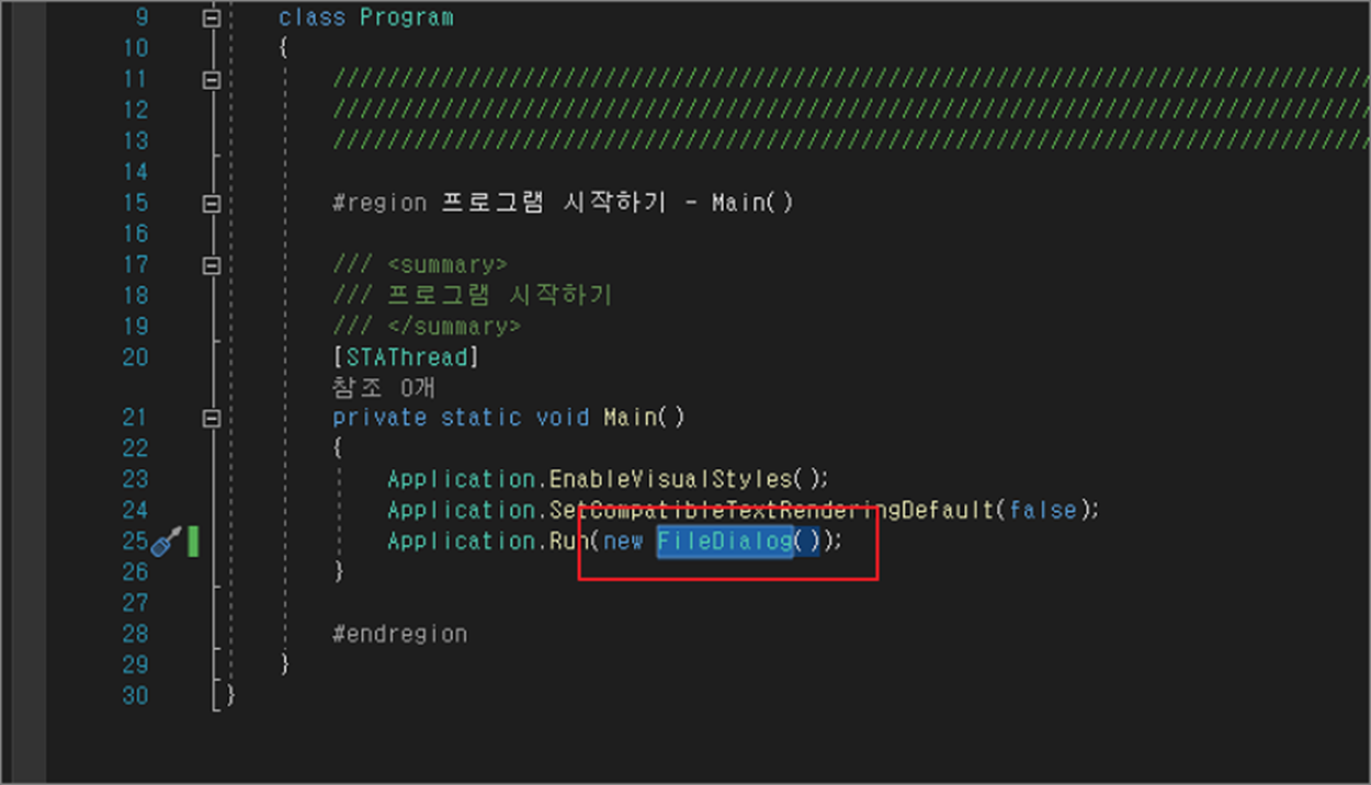 ▼ Program.cs 소스에서 Main() 함수로 갑니다. 그리고 Application.Run() 파라미터에 new FileDialog 를 new MainDialog 로 변경합니다. 프로젝트 시작 폼은 이곳에 인자로 들어간 개체입니다.