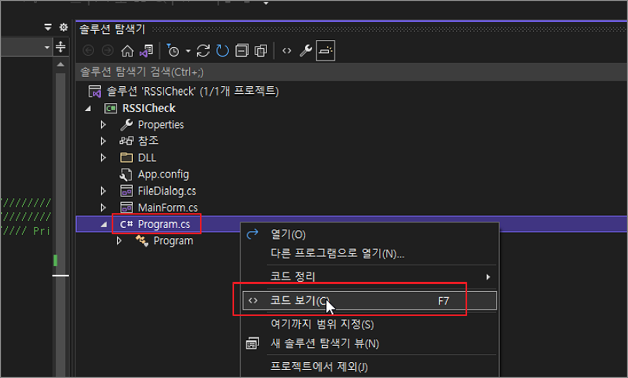 ▼ 탐색기에서 Program.cs 를 찾아 더블 클릭하거나 오른쪽 마우스 > 코드 보기 를 선택합니다.